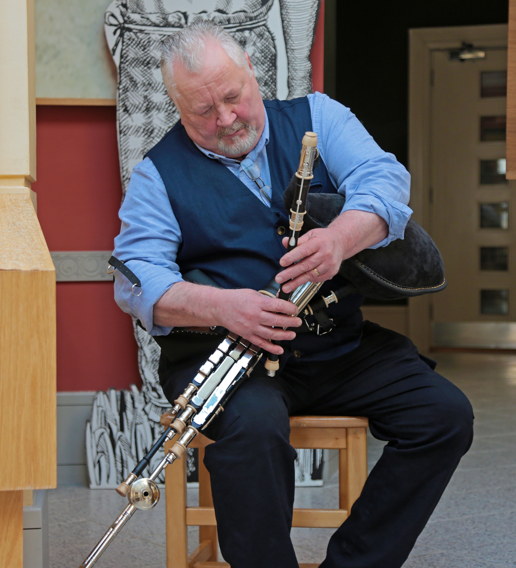 Caption: Noel Carberry on th Uilleann Pipes at Corlea Trackway Centre