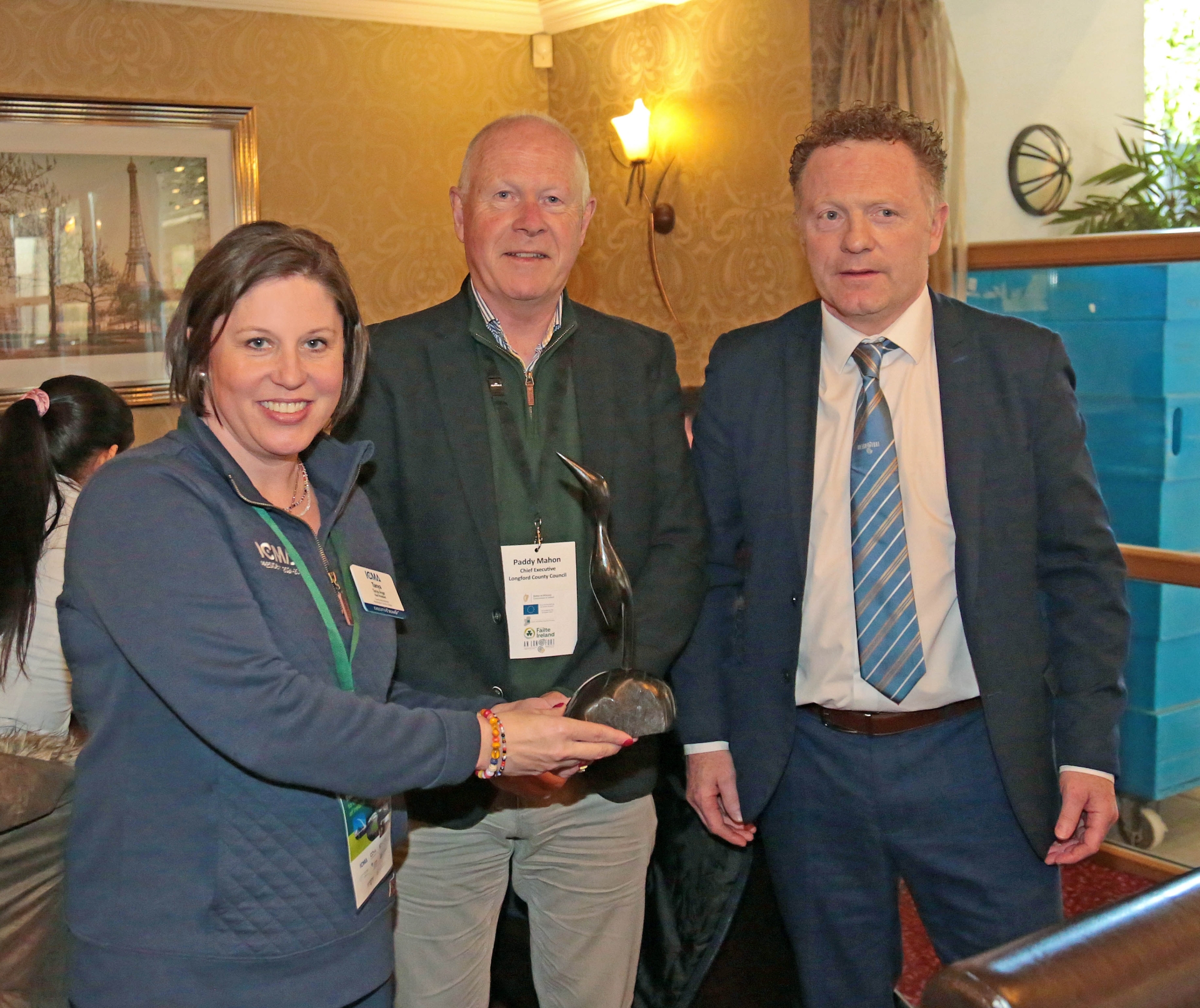 Caption: Chief Executive of Longford County Council and Chair of The County and City Management Association, Paddy Mahon and Cathaoirleach of Longford County Council, Cllr Garry Murtagh pictured making a presentation of bog oak sculpture to Tanya Ange, Outgoing President of the ICMA Picture: Shelley Corcoran