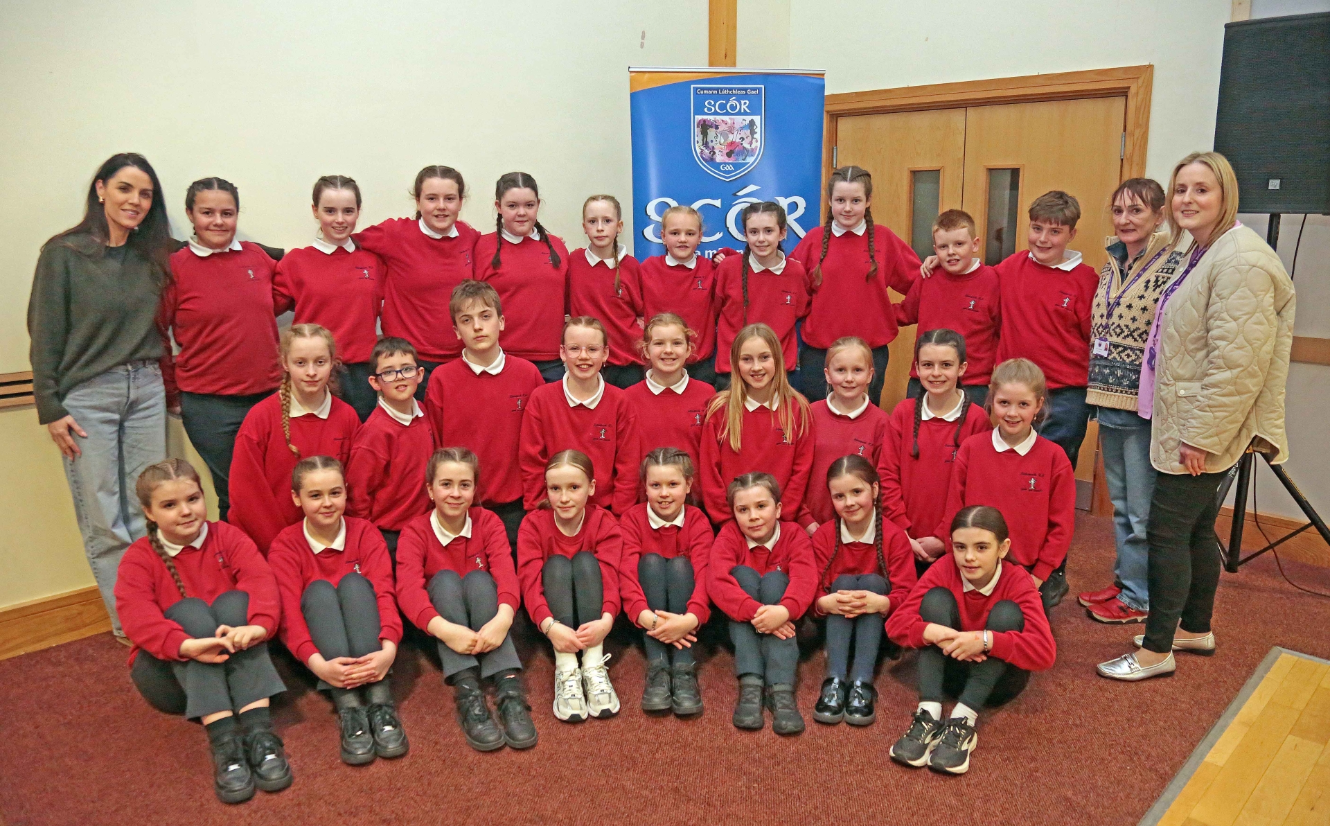 Caption: Stonepark NS pupils with Doireann Trappe, Eleanor McLoughlin and Sylvia Johnston at the 2026 Longford school Scór county final