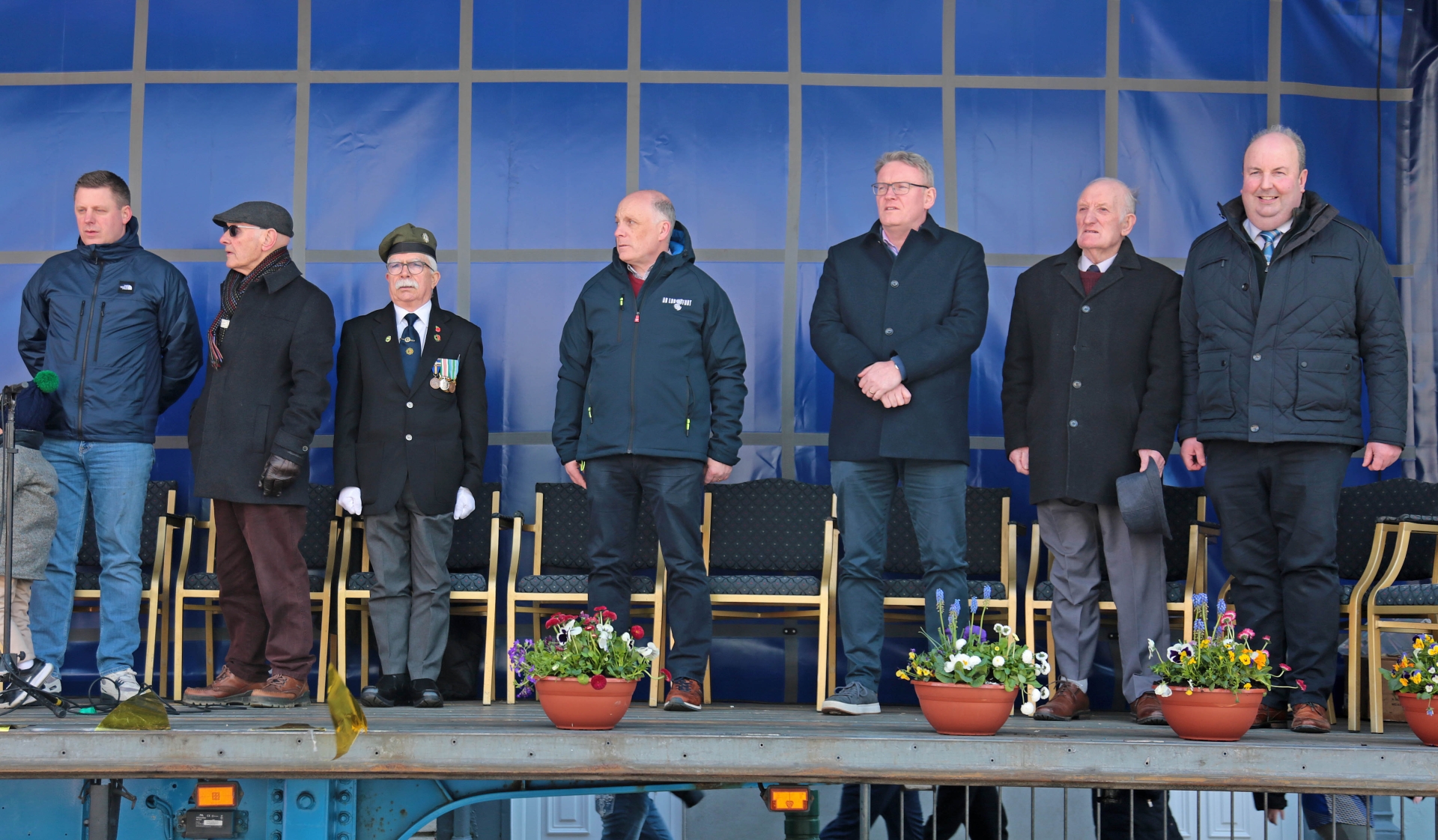 Caption: Cllr David Cassidy, Jody Sheridan, Hugh Farrell, Cllr Padraig McNamara, Deputy Micheál Carrigy, Terry McGovern and Cllr Colin Dalton on the review stand ahead of the Granard Easter Festival parade getting underway on Sunday Picture: Shelley Corcoran