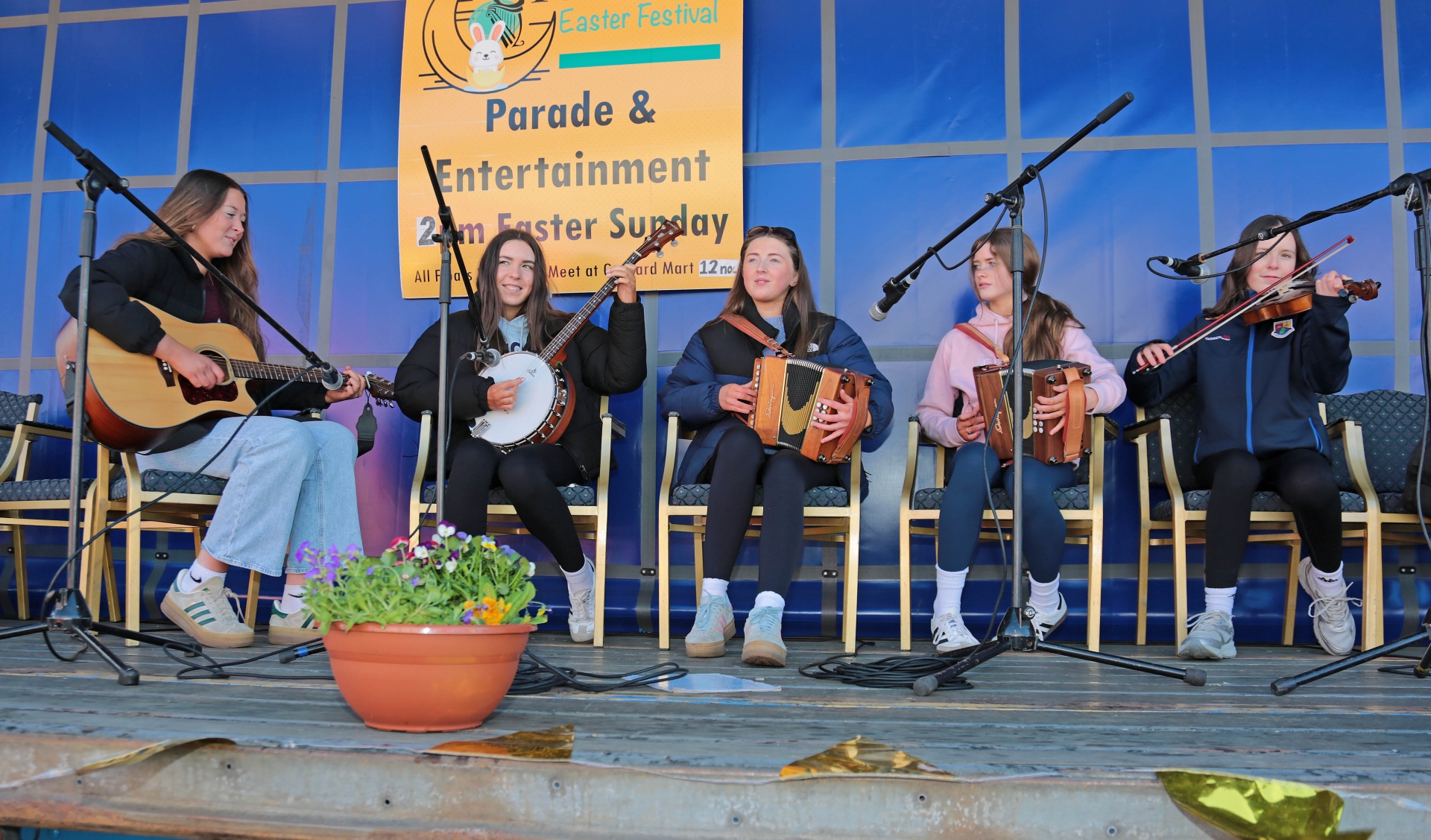 Caption: Musicians from the John Dungan CCE branch entertaining spectators from the review stand at the Granard Easter Festival parade on Sunday