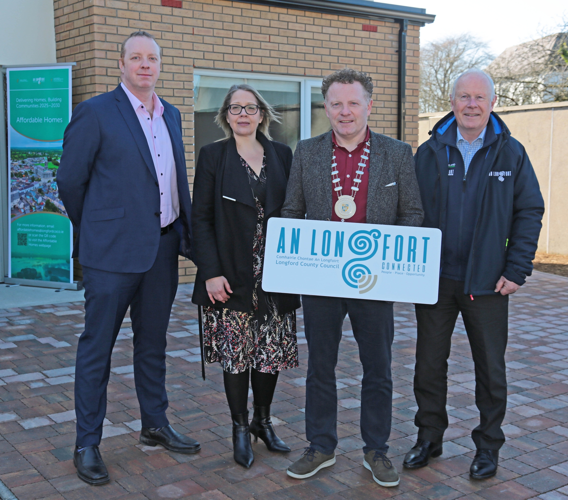 Caption: Stephen Barry, Adaview Ltd, Developer, Samantha Healy, Director of Services with Longford County Council, Cathaoirleach of Longford County Council Cllr Garry Murtagh and Chief Executive of Longford County Council Paddy Mahon pictured in one of the properties for sale through the Affordable Purchase Scheme with Longford County Council Picture: Shelley Corcoran