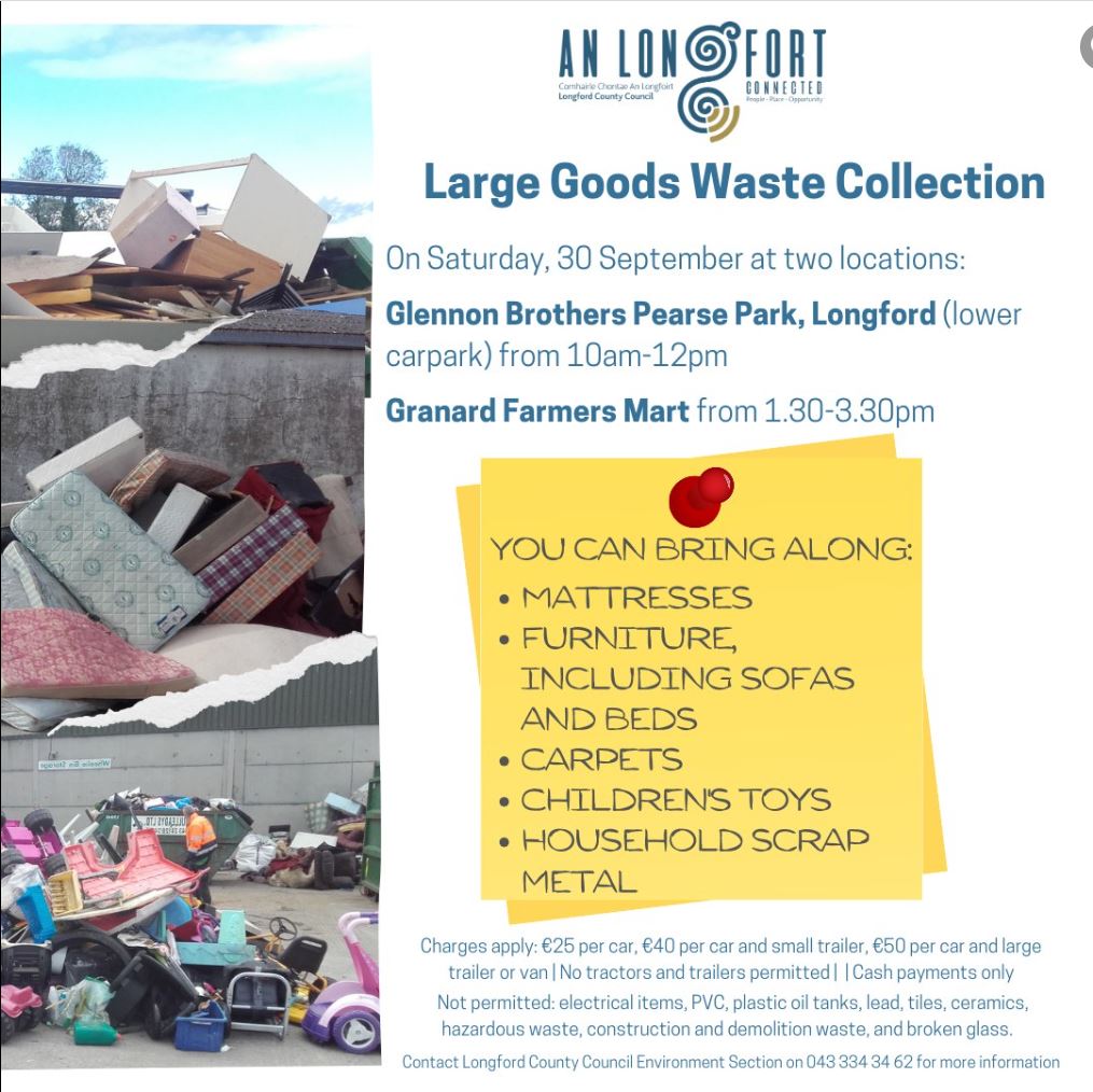 Beidh bailiúchán mór earraí á reáchtáil ag Comhairle Contae Longfoirt sna láithreacha seo a leanas: