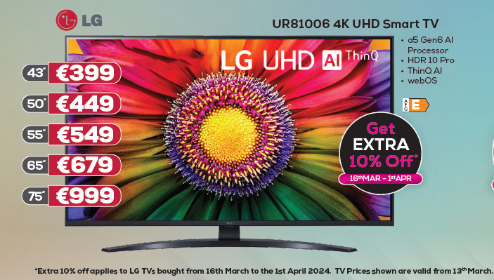 Providers have a fantastic selection of visual and audio equipment to choose from and have LG UHD Smart TV's from €399 for a 43 inch.
