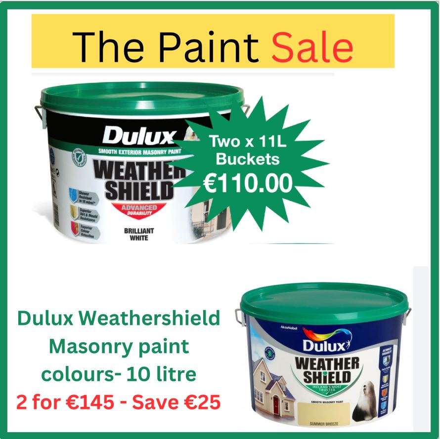 If you are getting ready to paint this spring, Dulux Weathershield Brilliant White is on offer with Two x 11L Buckets for €110. Dulux Weathershield Masonry paint colours 10 litre is 2 for €145.