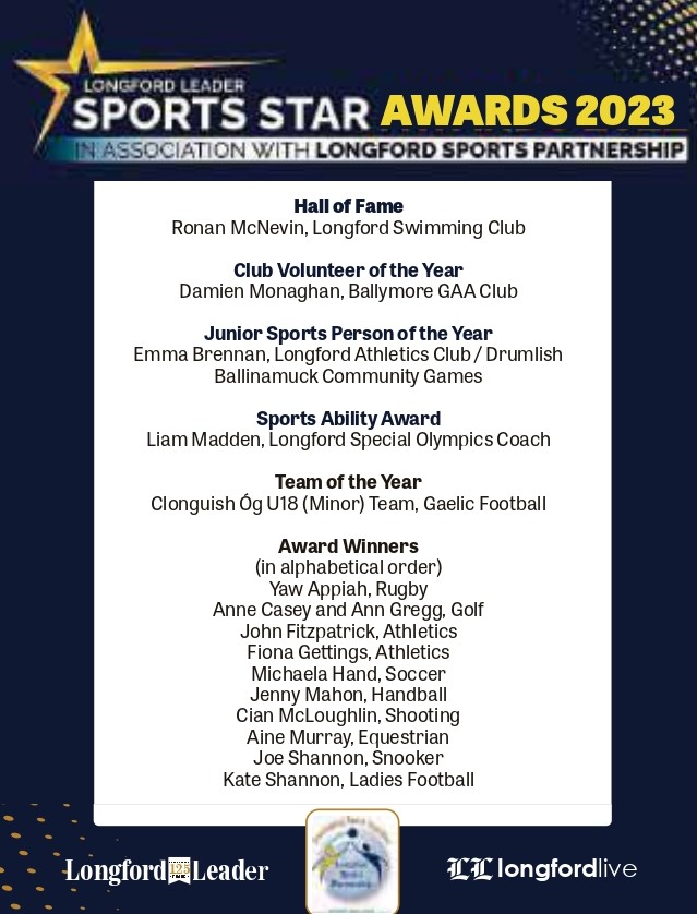 Each of the fifteen award recipients, and you can read about their fantastic achievements in this special supplement, will also be in the running for the coveted title of Overall 2023 Longford Leader Sports Star of the Year and this will be revealed on the night of the gala presentation.