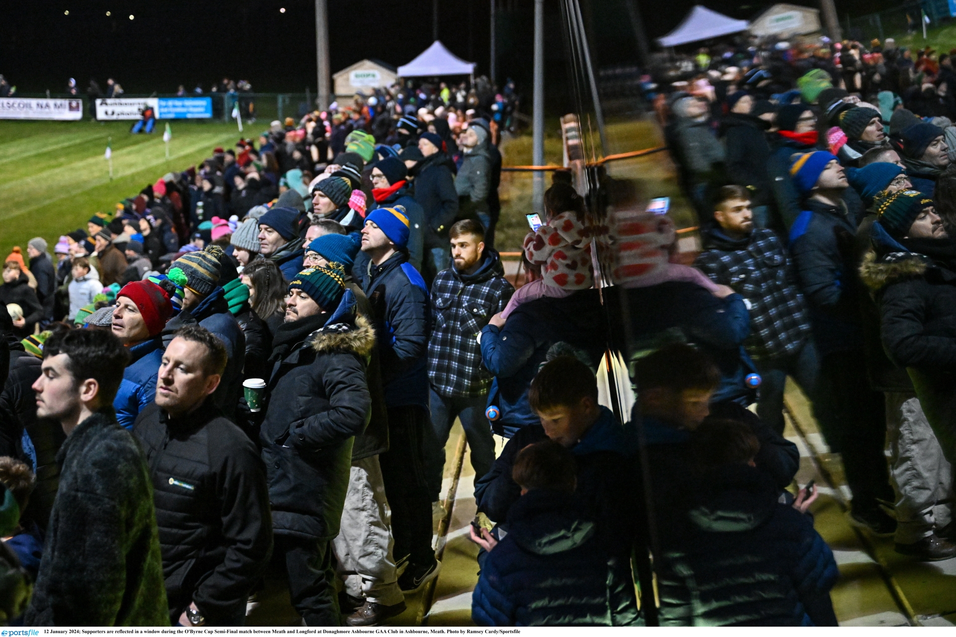 Caption: Supporters are reflected in a window during the O'Byrne Cup Semi-Final match between Meath and Longford at Donaghmore Ashbourne GAA Club in Ashbourne, Meath. Photo by Ramsey Cardy/Sportsfile
