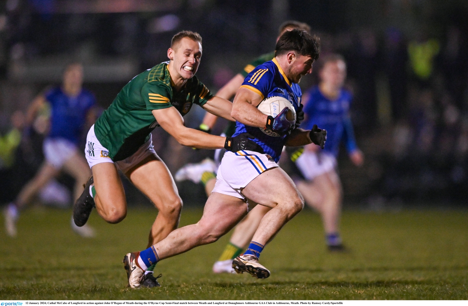 Caption: Cathal McCabe of Longford in action against John O’Regan of Meath during the O'Byrne Cup Semi-Final match between Meath and Longford at Donaghmore Ashbourne GAA Club in Ashbourne, Meath. Photo by Ramsey Cardy/Sportsfile