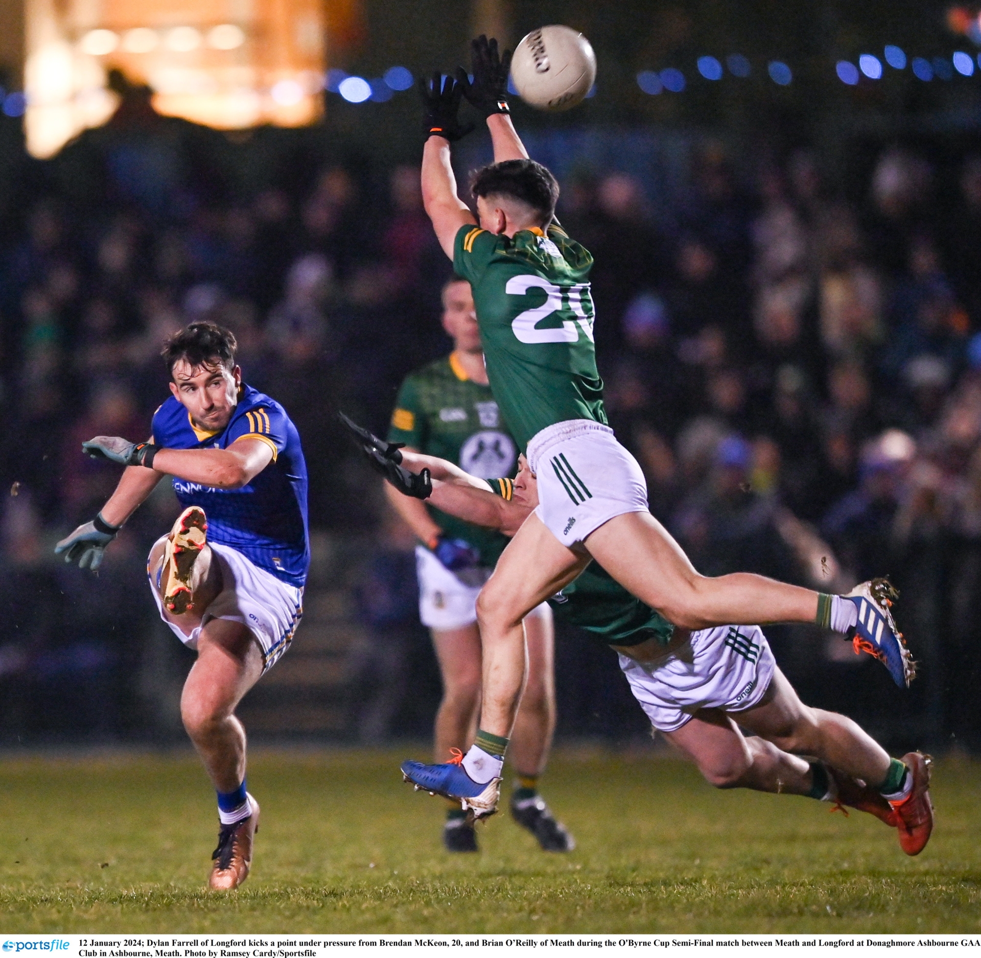 Caption: Dylan Farrell of Longford kicks a point under pressure from Brendan McKeon, 20, and Brian O’Reilly of Meath during the O'Byrne Cup Semi-Final match between Meath and Longford at Donaghmore Ashbourne GAA Club in Ashbourne, Meath. Photo by Ramsey Cardy/Sportsfile