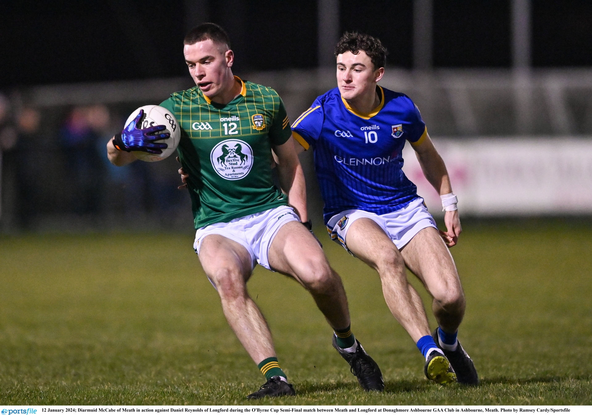 Caption: Diarmuid McCabe of Meath in action against Daniel Reynolds of Longford during the O'Byrne Cup Semi-Final match between Meath and Longford at Donaghmore Ashbourne GAA Club in Ashbourne, Meath. Photo by Ramsey Cardy/Sportsfile