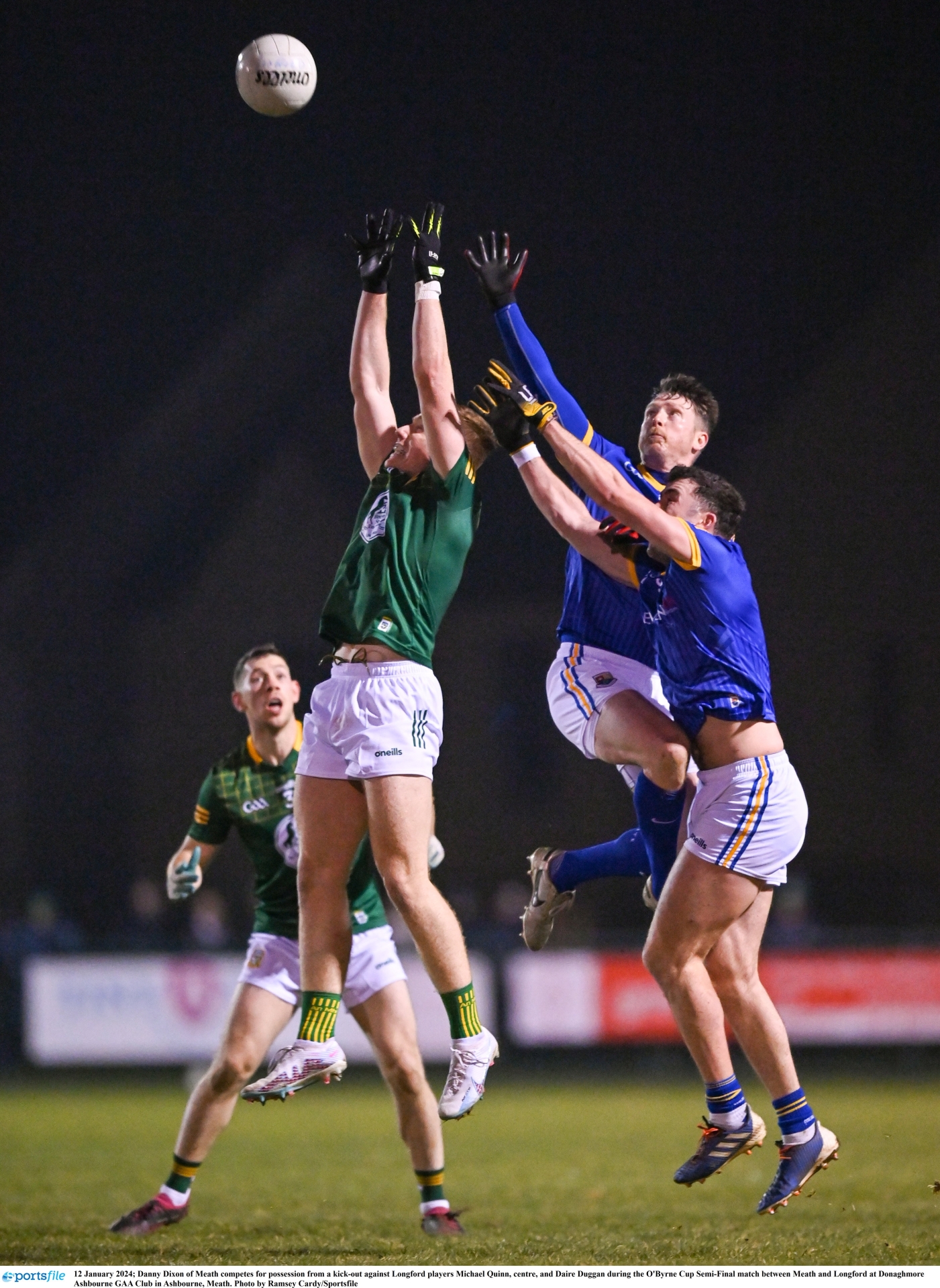 Caption: Danny Dixon of Meath competes for possession from a kick-out against Longford players Michael Quinn, centre, and Daire Duggan during the O'Byrne Cup Semi-Final match between Meath and Longford at Donaghmore Ashbourne GAA Club in Ashbourne, Meath. Photo by Ramsey Cardy/Sportsfile