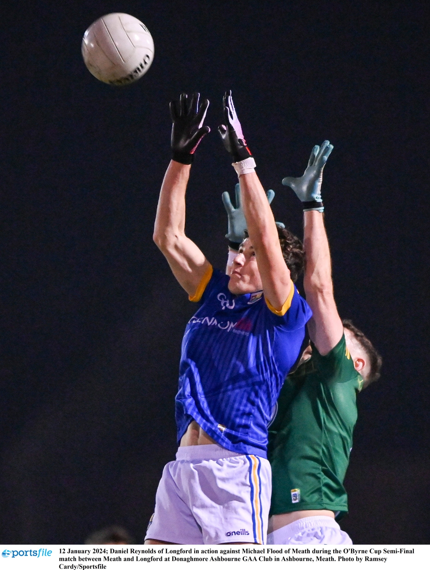 Caption: Daniel Reynolds of Longford in action against Michael Flood of Meath during the O'Byrne Cup Semi-Final match between Meath and Longford at Donaghmore Ashbourne GAA Club in Ashbourne, Meath. Photo by Ramsey Cardy/Sportsfile