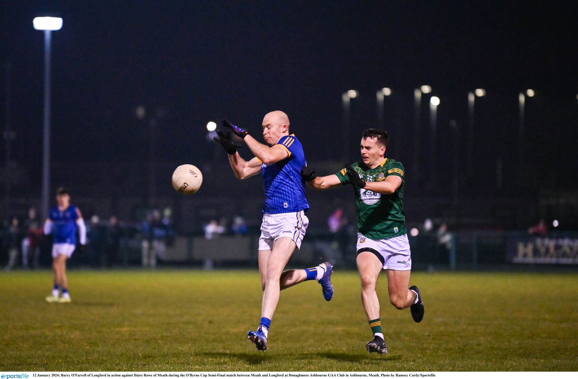 Caption: Barry O'Farrell of Longford in action against Daire Rowe of Meath during the O'Byrne Cup Semi-Final match between Meath and Longford at Donaghmore Ashbourne GAA Club in Ashbourne, Meath. Photo by Ramsey Cardy/Sportsfile