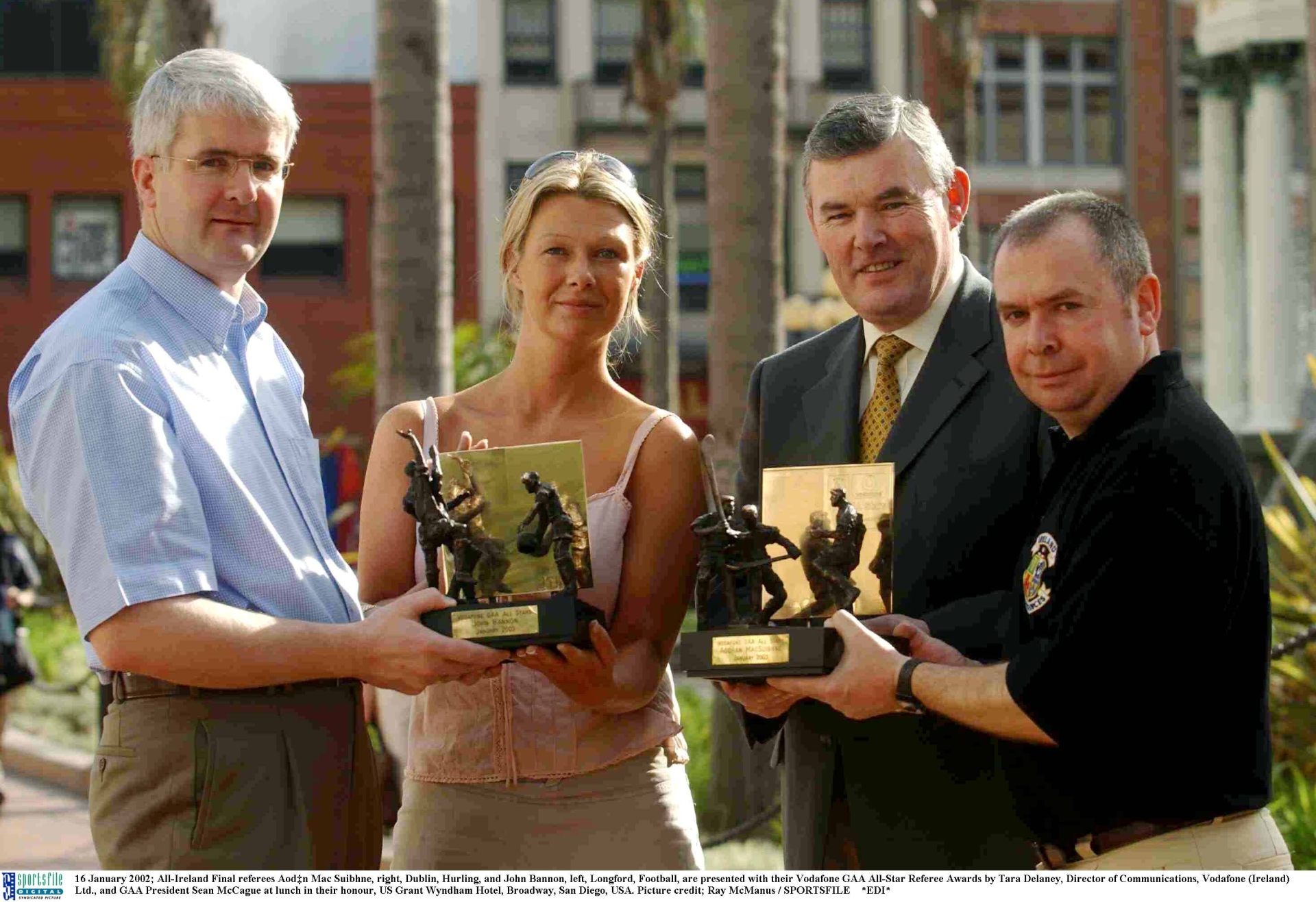 Caption: 16 January 2002; All-Ireland Final referees Aodán MacSuibhne, right, Dublin, Hurling, and John Bannon, left, Longford, Football, are presented with their Vodafone GAA All-Star Referee Awards by Tara Delaney, Director of Communications, Vodafone (Ireland) Ltd., and GAA President Sean McCague at lunch in their honour, US Grant Wyndham Hotel, Broadway, San Diego, USA. Picture credit; Ray McManus / SPORTSFILE