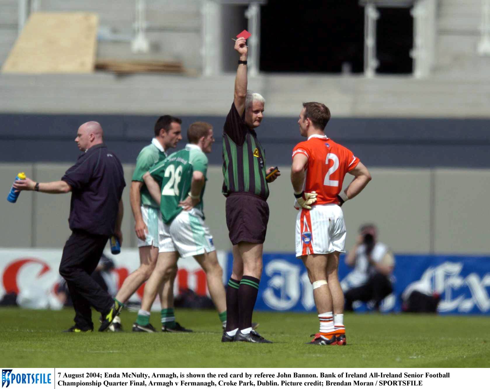 Caption: 7 August 2004; Enda McNulty, Armagh, is shown the red card by referee John Bannon. Bank of Ireland All-Ireland Senior Football Championship Quarter Final, Armagh v Fermanagh, Croke Park, Dublin. Picture credit; Brendan Moran / SPORTSFILE