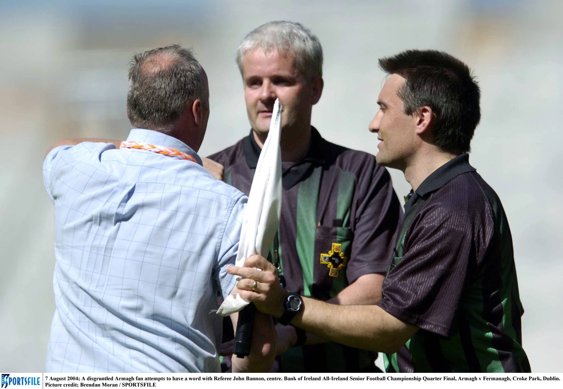 Caption: 7 August 2004; A disgruntled Armagh fan attempts to have a word with Referee John Bannon, centre. Bank of Ireland All-Ireland Senior Football Championship Quarter Final, Armagh v Fermanagh, Croke Park, Dublin. Picture credit; Brendan Moran / SPORTSFILE