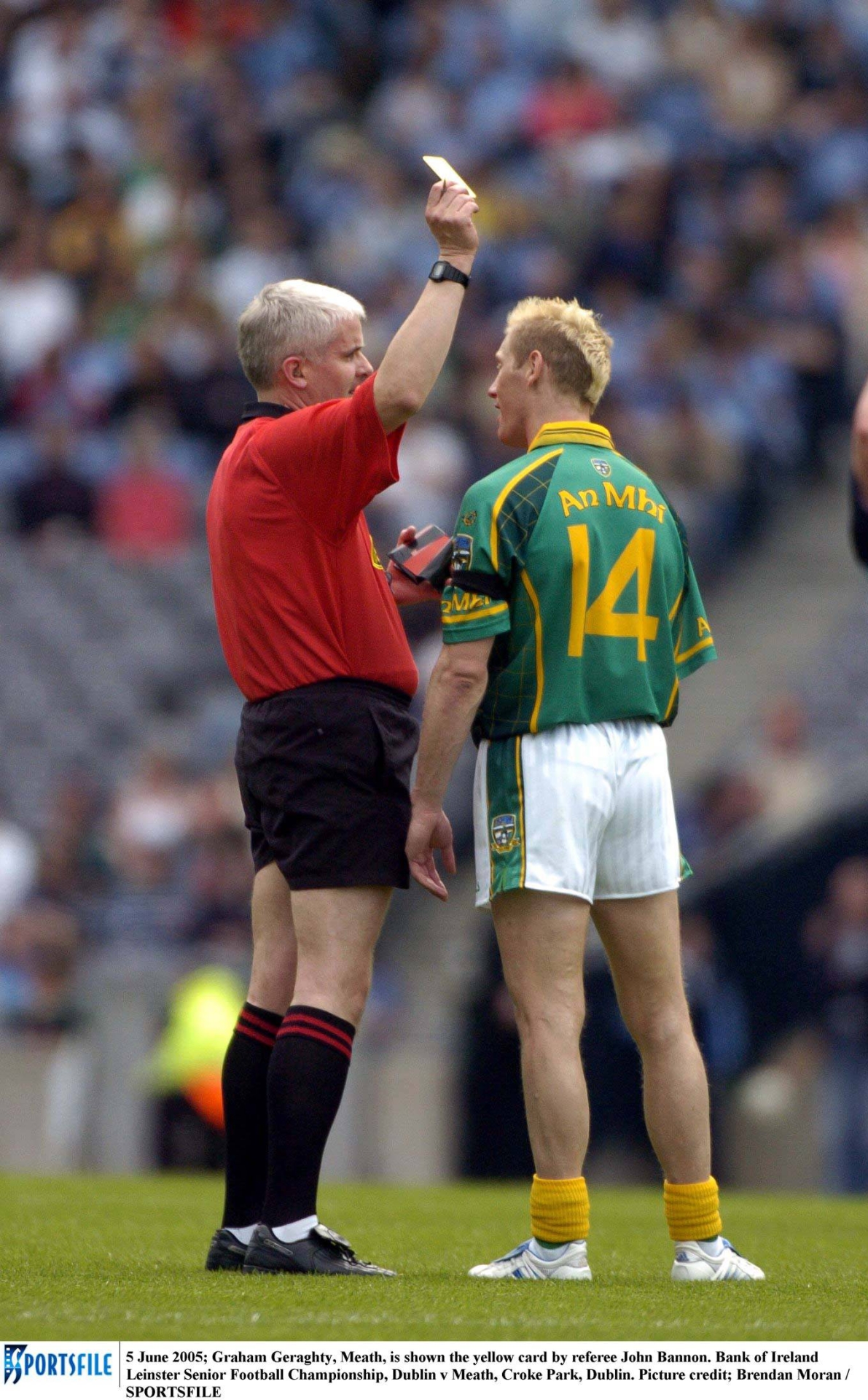 Caption: 5 June 2005; Graham Geraghty, Meath, is shown the yellow card by referee John Bannon. Bank of Ireland Leinster Senior Football Championship, Dublin v Meath, Croke Park, Dublin. Picture credit; Brendan Moran / SPORTSFILE