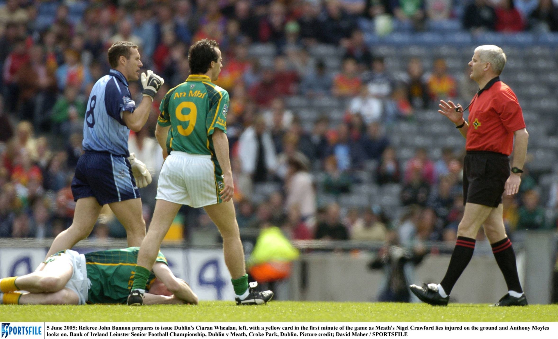 Caption: 5 June 2005; Referee John Bannon prepares to issue Dublin's Ciaran Whelan, left, with a yellow card in the first minute of the game as Meath's Nigel Crawford lies injured on the ground and Anthony Moyles looks on. Bank of Ireland Leinster Senior Football Championship, Dublin v Meath, Croke Park, Dublin. Picture credit; David Maher / SPORTSFILE