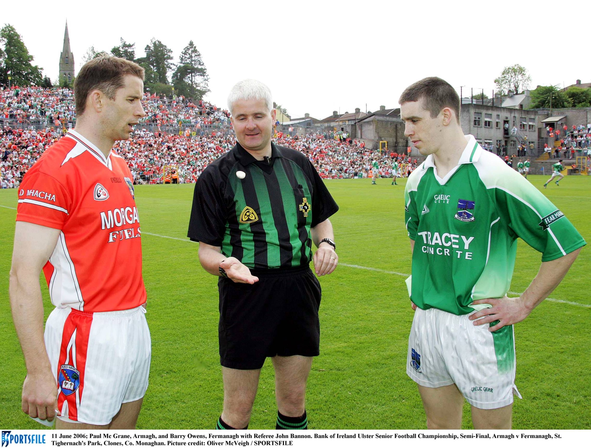 Caption: 11 June 2006; Paul McGrane, Armagh, and Barry Owens, Fermanagh with Referee John Bannon. Bank of Ireland Ulster Senior Football Championship, Semi-Final, Armagh v Fermanagh, St. Tighernach's Park, Clones, Co. Monaghan. Picture credit: Oliver McVeigh / SPORTSFILE