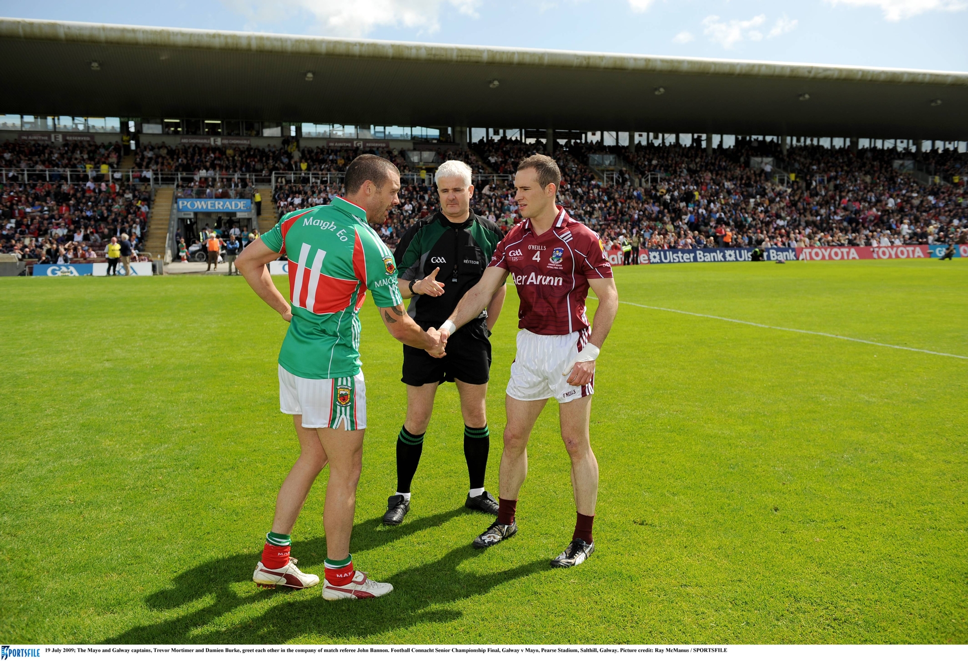 Caption: 19 July 2009; The Mayo and Galway captains, Trevor Mortimer and Damien Burke, greet each other in the company of match referee John Bannon. Football Connacht Senior Championship Final, Galway v Mayo, Pearse Stadium, Salthill, Galway. Picture credit: Ray McManus / SPORTSFILE