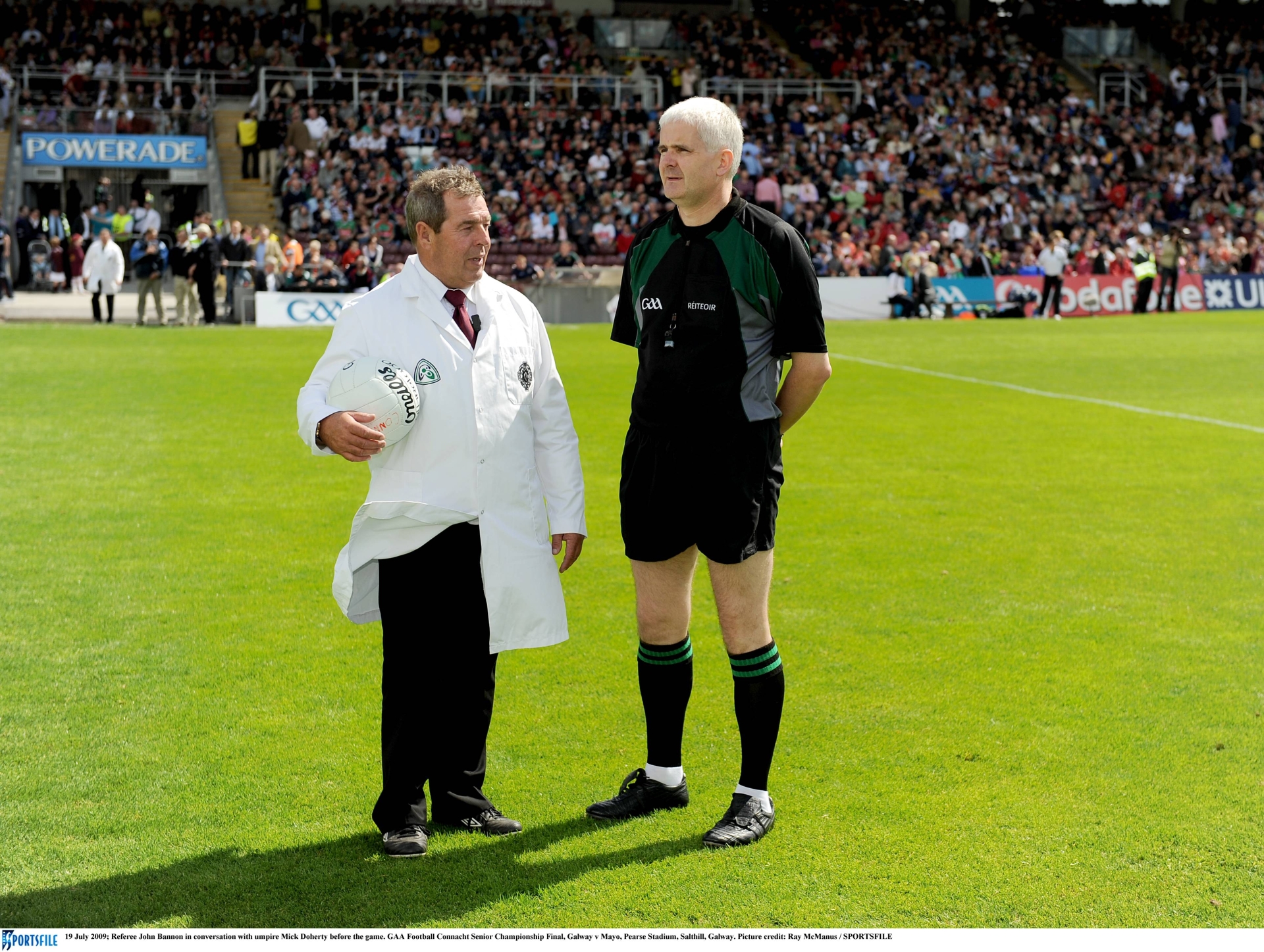 Caption: 19 July 2009; Referee John Bannon in conversation with umpire Mick Doherty before the game. GAA Football Connacht Senior Championship Final, Galway v Mayo, Pearse Stadium, Salthill, Galway. Picture credit: Ray McManus / SPORTSFILE