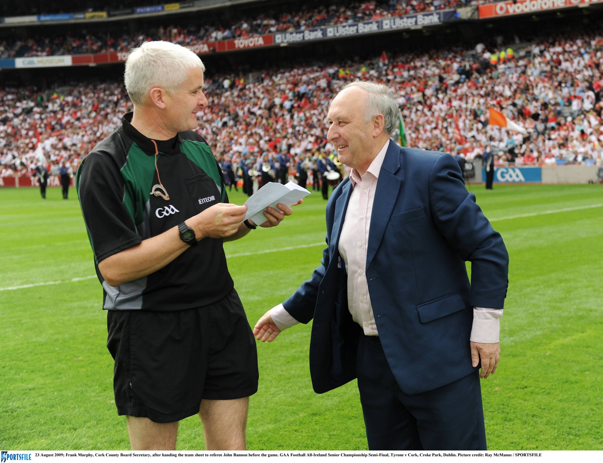 Caption: 23 August 2009; Frank Murphy, Cork County Board Secretary, after handing the team sheet to referee John Bannon before the game. GAA Football All-Ireland Senior Championship Semi-Final, Tyrone v Cork, Croke Park, Dublin. Picture credit: Ray McManus / SPORTSFILE