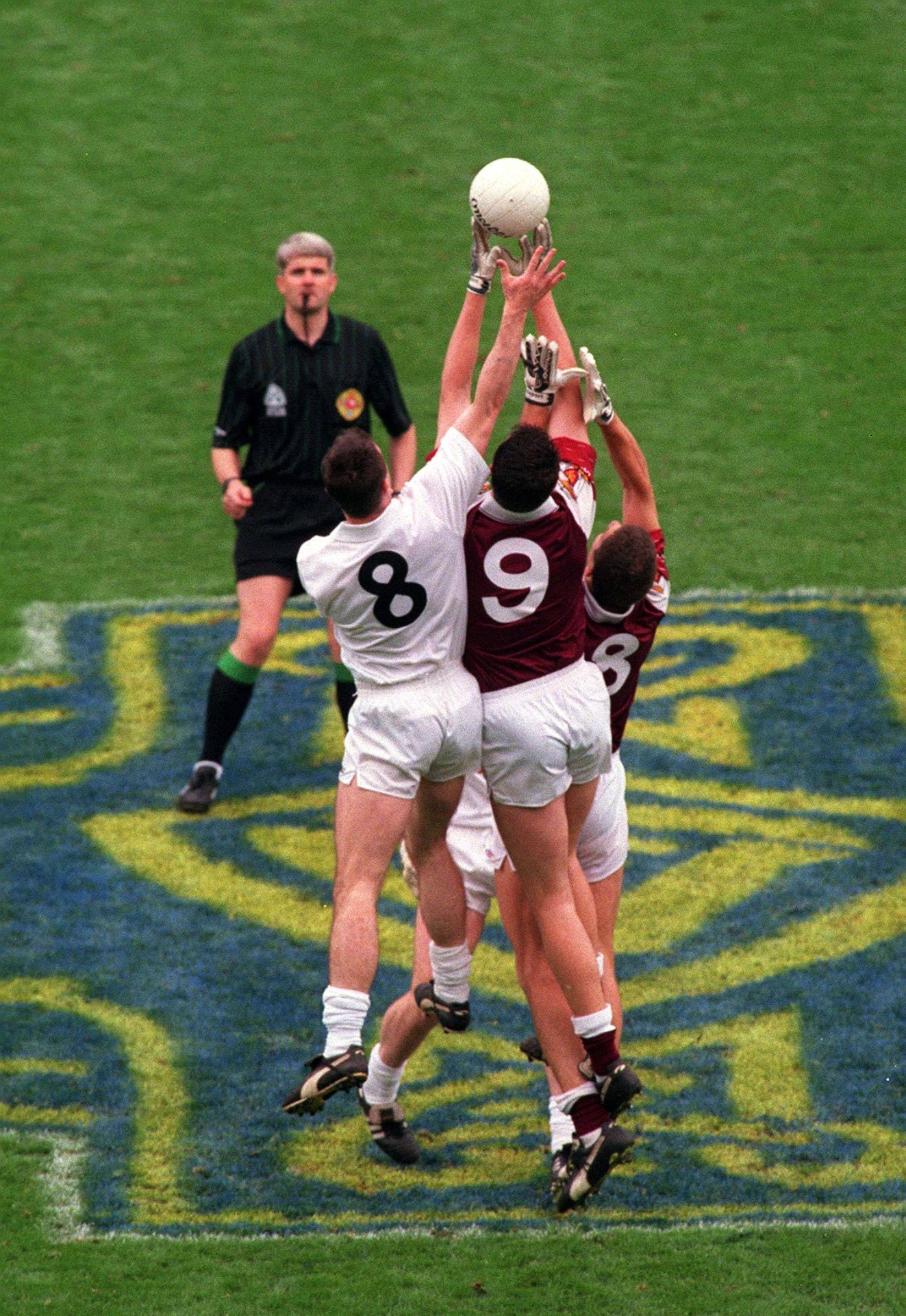 Caption: 27 September 1998; Referee John Bannon throws the ball in between Kildare players Niall Buckley, 8, and Willie McCreery and Galway players Seán Ó Domhnaill, 9, and Kevin Walsh during the Bank of Ireland All-Ireland Senior Football Championship Final match between Kildare and Galway at Croke Park in Dublin. Photo by David Maher/Sportsfile
