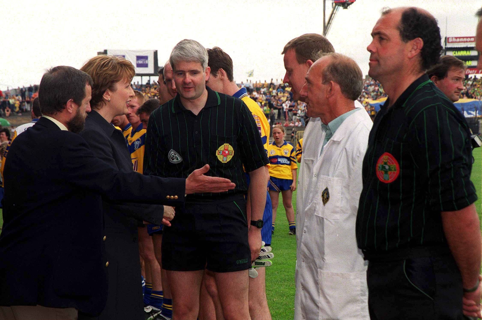 Caption: 16 July 2000; President of Ireland Mary McAleese is introduced to referee John Bannon and the match officials by Sean Kelly, Munster Council Chairman ahead of the Bank of Ireland Munster Senior Football Championship Final between Kerry and Clare at the Gaelic Grounds in Limerick. Photo By Brendan Moran/Sportsfile