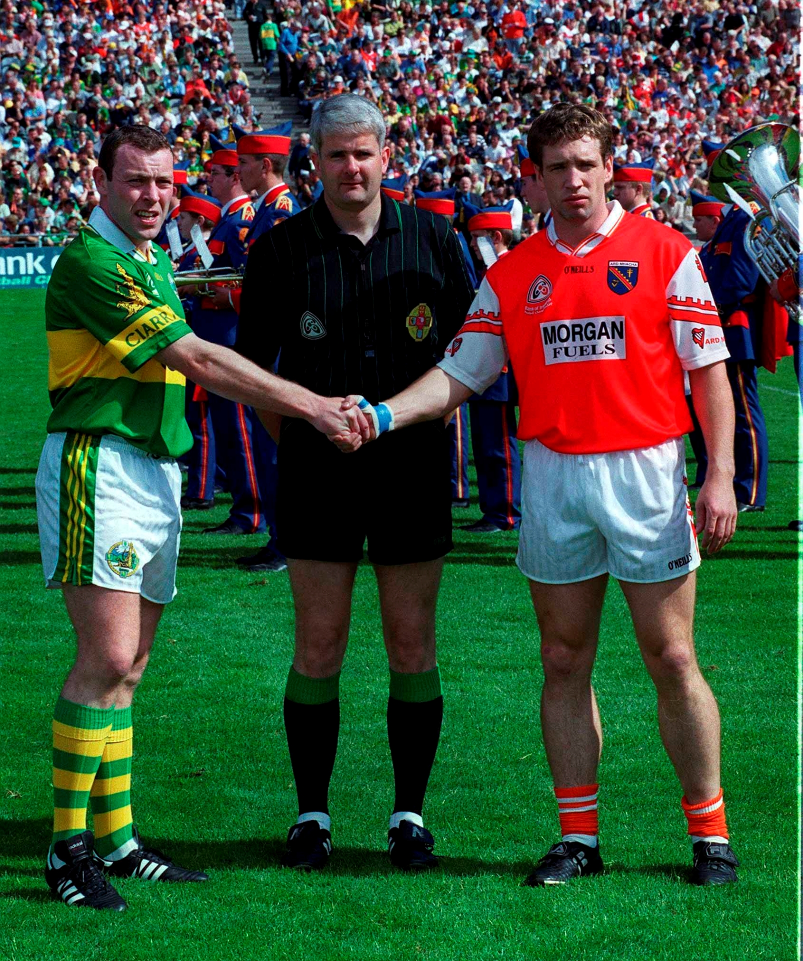 Caption: 20 August 2000; Referee John Bannon with team captains Seamus Moynihan of Kerry and Kieran McGeeney of Armagh prior to the Bank of Ireland All-Ireland Senior Football Championship Semi-Final match between Kerry and Armagh at Croke Park in Dublin. Photo by Ray McManus/Sportsfile
