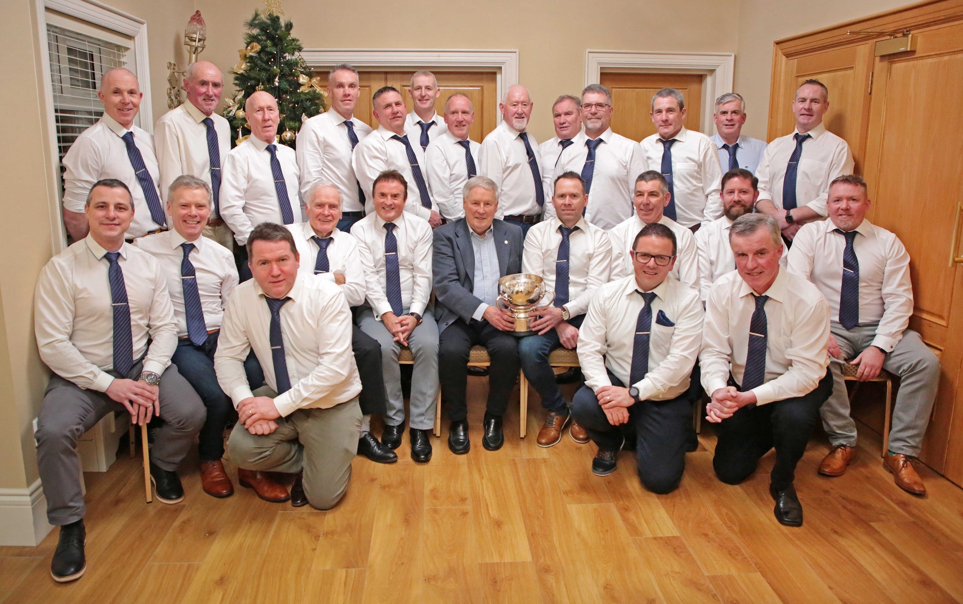 Caption: Members of the Dromard squad, managed by Denis Connerton, are also pictured with the then Longford GAA Chairman TJ Ward (Legan) and the Connolly Cup at a reunion to mark the 25th anniversary of their 1999 Senior Football Championship title triumph at the function in the Breffni Arms Hotel, Arva on Saturday December 28 last Photo: Shelley Corcoran
