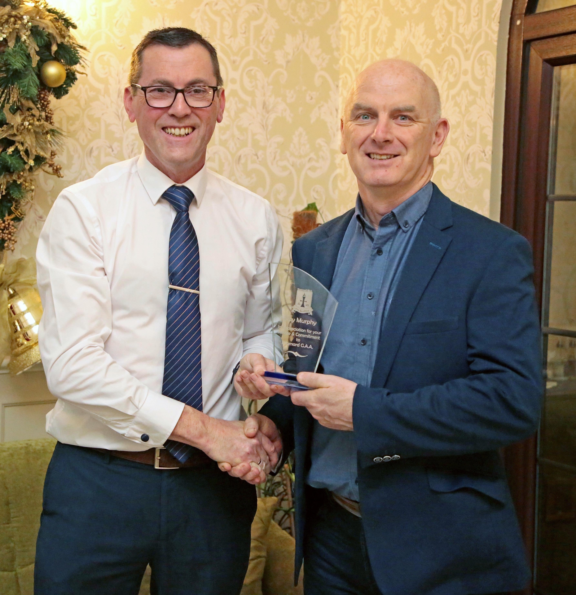 Caption: John Duffy presenting outgoing secretary appreciation award to Ray Murphy