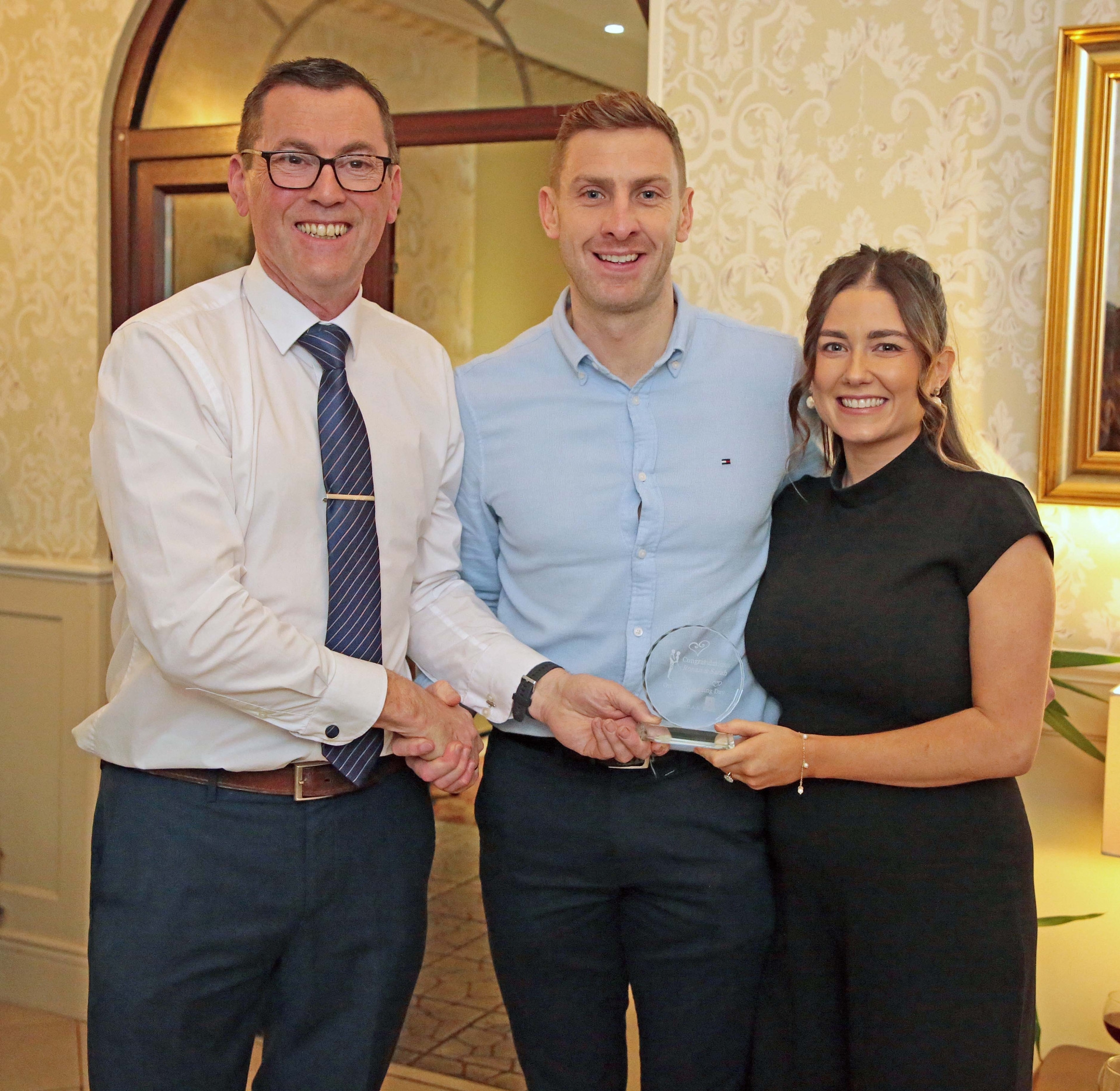 Caption: John Duffy presenting a newly married congratulations award to Ronan and Sarah McEntire