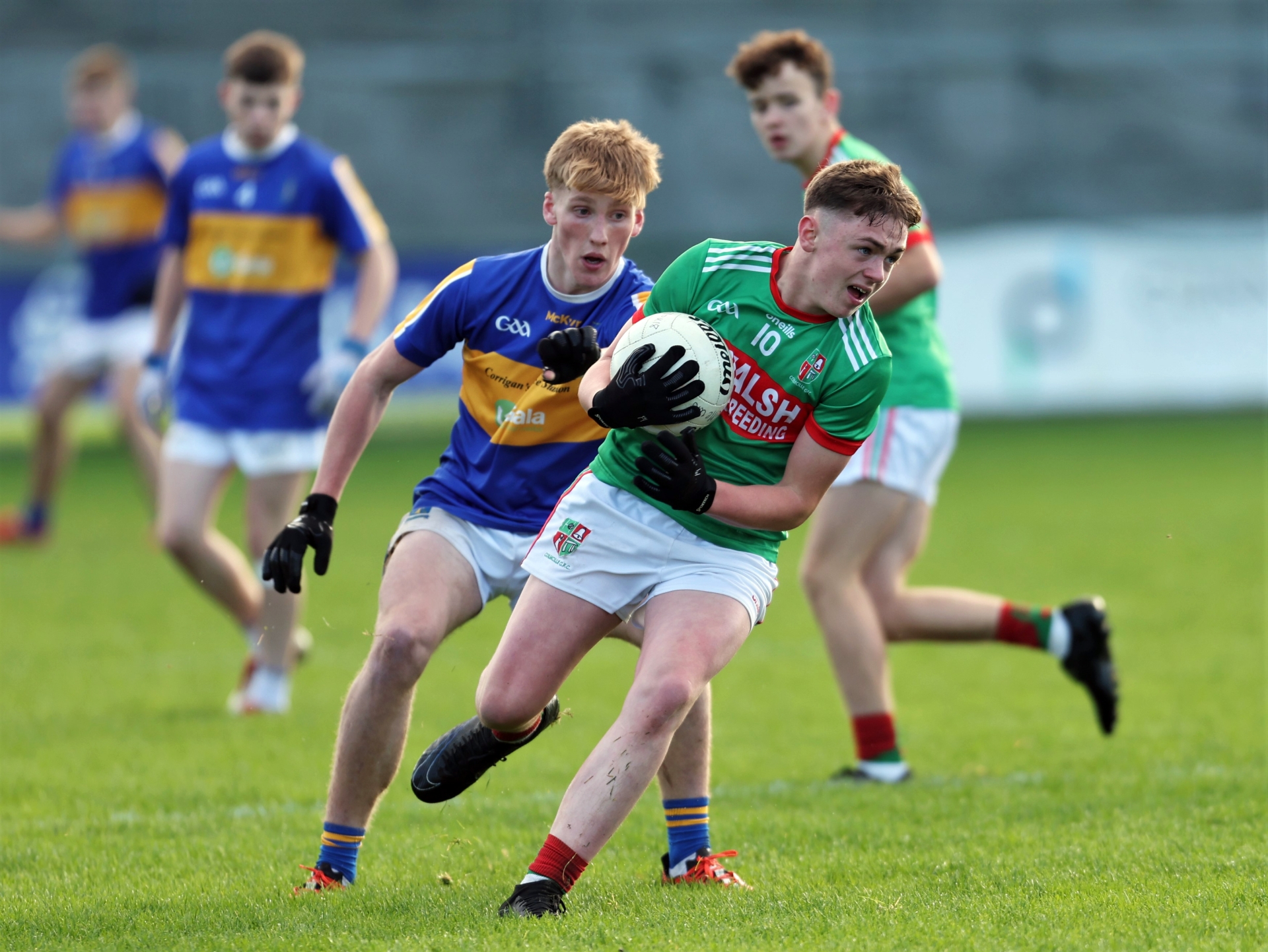 Caption: Steven Martin (St Colmcille's) is tackled by William McEntire (St Francis Dromard)