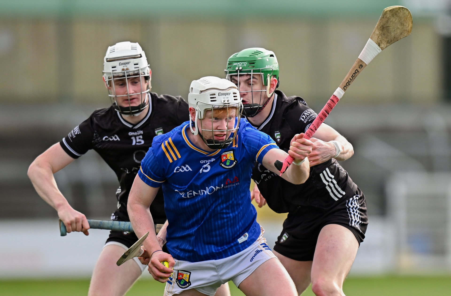 Caption: Seán Tiernan of Longford in action against Sligo players Ronan Molloy, right, and Thomas Cawley during the Allianz Hurling League Division 4 final match between Sligo and Longford at Markievicz Park in Sligo. Photo by Seb Daly/Sportsfile