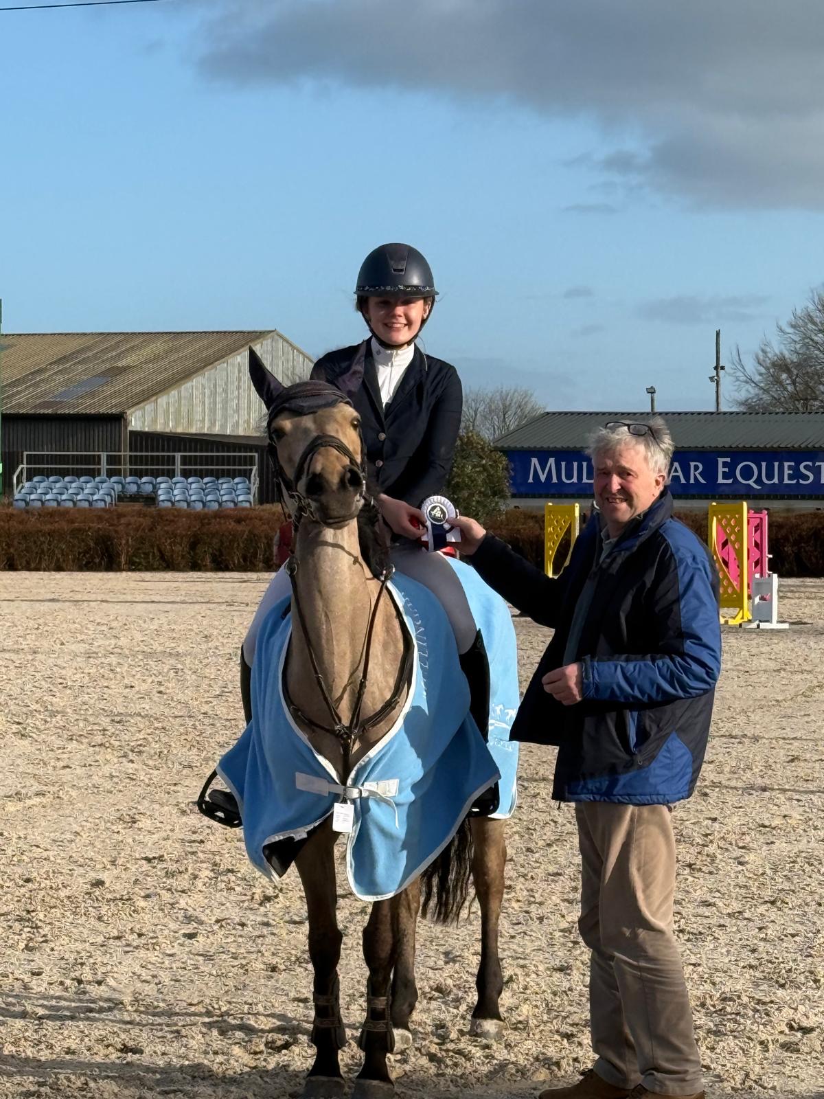 Caption: Ella Duignan receiving her 1st place rosette for the 1m10 individuals category