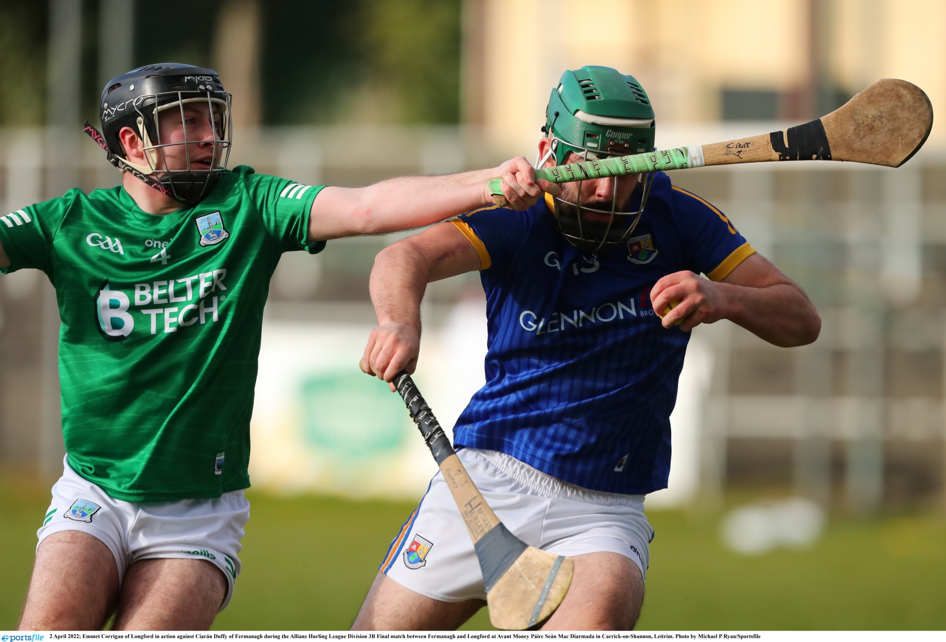 Caption: Clash of the ash...Emmet Corrigan of Longford in action against Ciarán Duffy of Fermanagh during the Allianz Hurling League Division 3B Final Photo by Michael P Ryan/Sportsfile