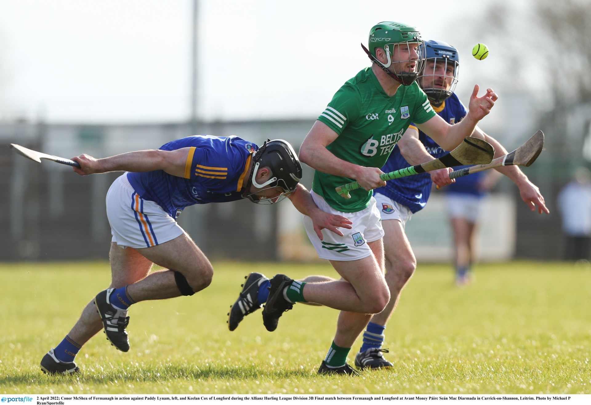 Caption: Conor McShea of Fermanagh in action against Paddy Lynam, left, and Keelan Cox of Longford during the Allianz Hurling League Division 3B Final Photo by Michael P Ryan/Sportsfile