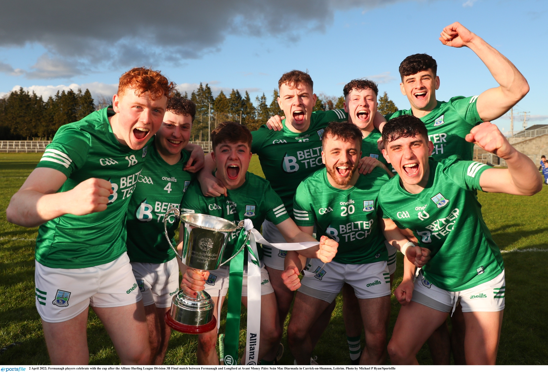 Caption: Fermanagh players celebrate with the cup after the Allianz Hurling League Division 3B Final against Longford at Avant Money Páirc Seán Mac Diarmada Photo by Michael P Ryan/Sportsfile