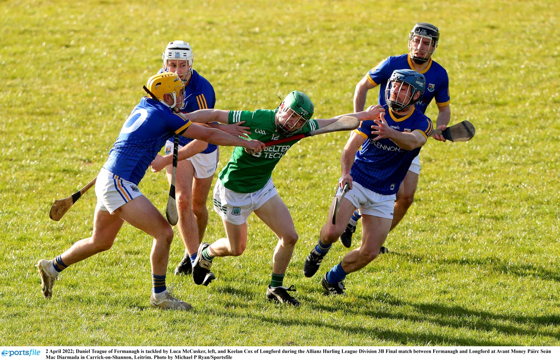 Caption: Daniel Teague of Fermanagh is tackled by Johnny Casey, left, and Keelan Cox of Longford during the Allianz Hurling League Division 3B Final Photo by Michael P Ryan/Sportsfile