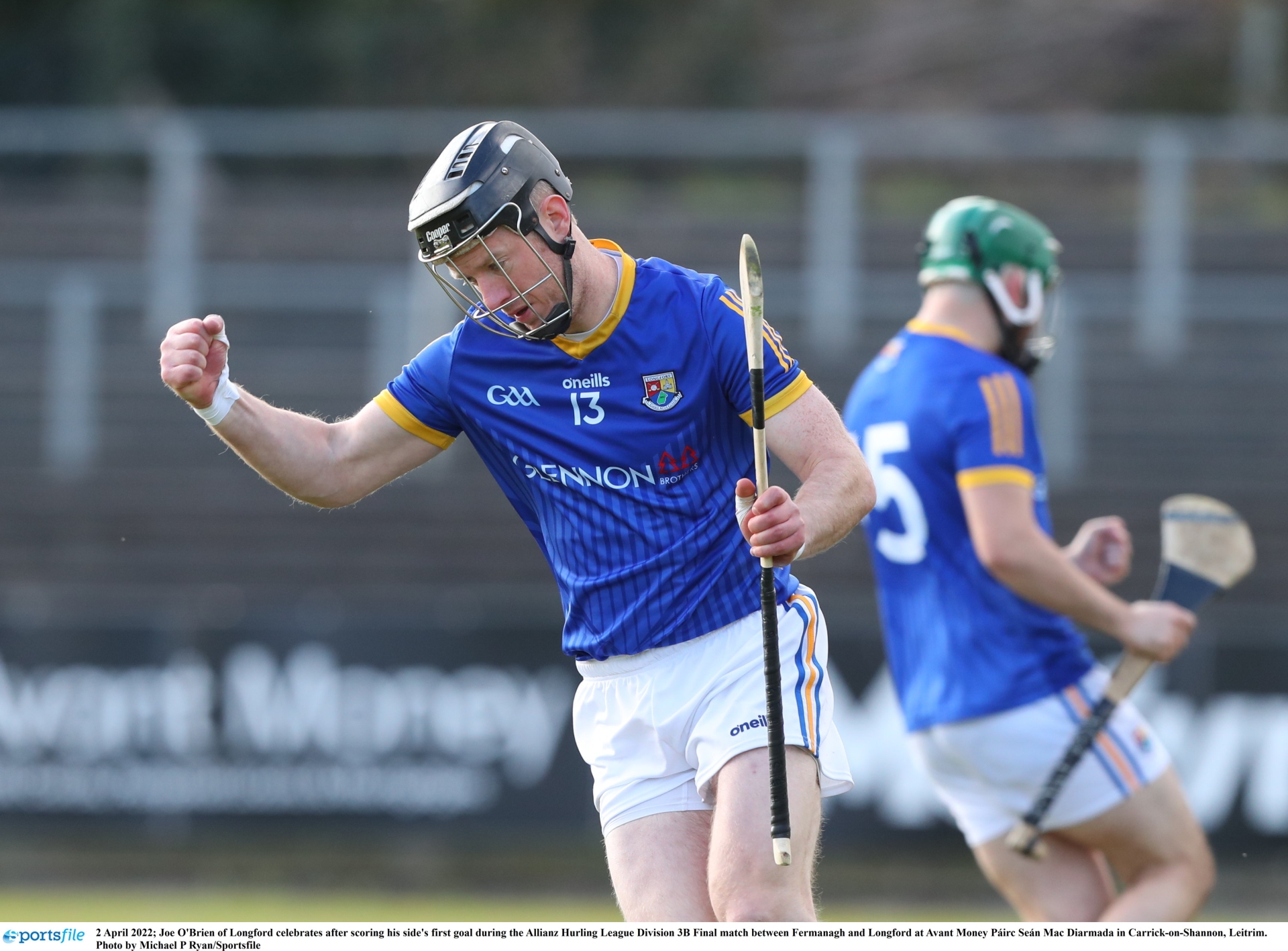 Caption: Joe O'Brien of Longford celebrates after scoring his side's first goal during the Allianz Hurling League Division 3B Final against Fermanagh Photo by Michael P Ryan/Sportsfile