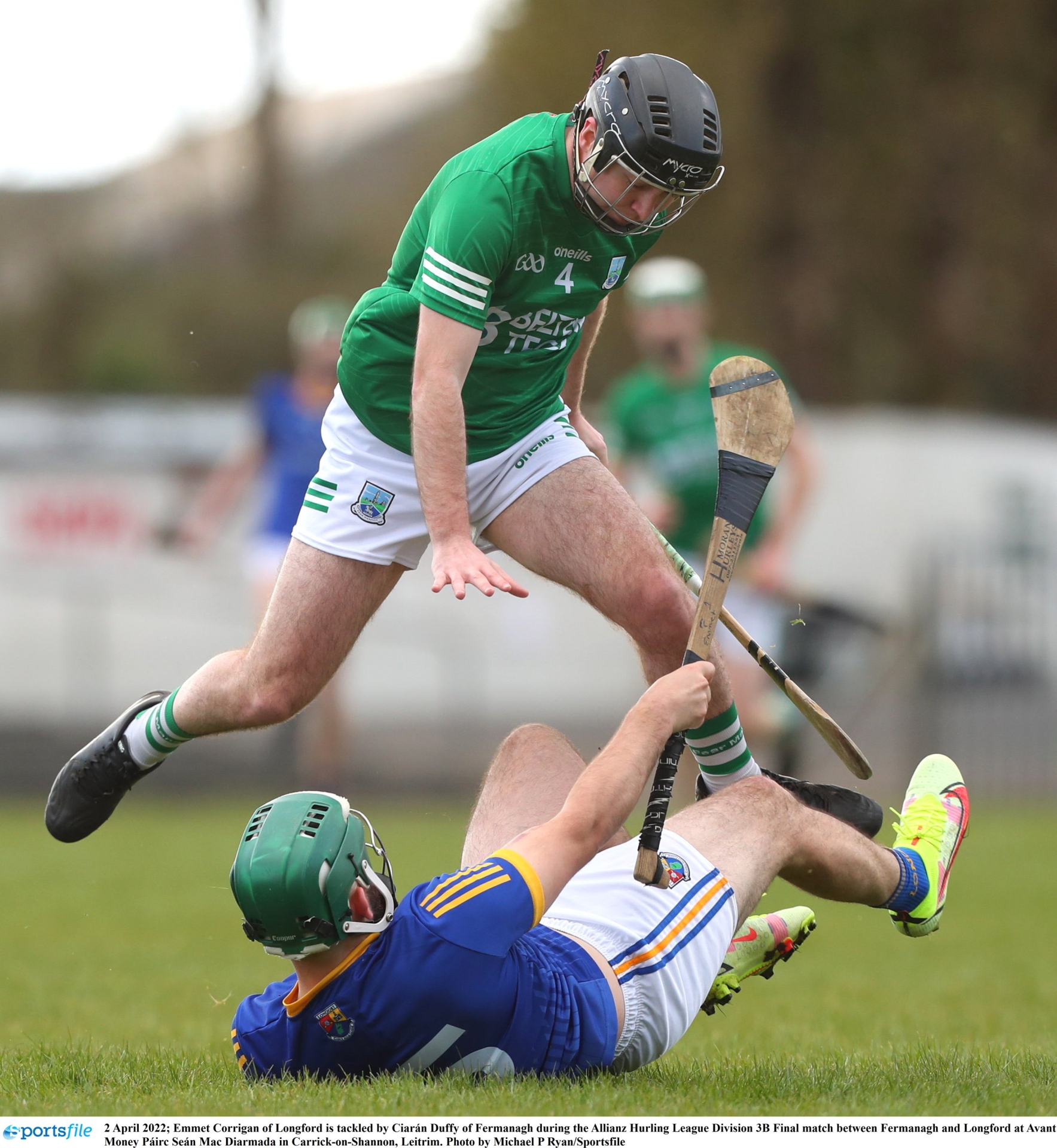 Caption: Emmet Corrigan of Longford is tackled by Ciarán Duffy of Fermanagh during the Allianz Hurling League Division 3B Final at Avant Money Páirc Seán Mac Diarmada Photo by Michael P Ryan/Sportsfile