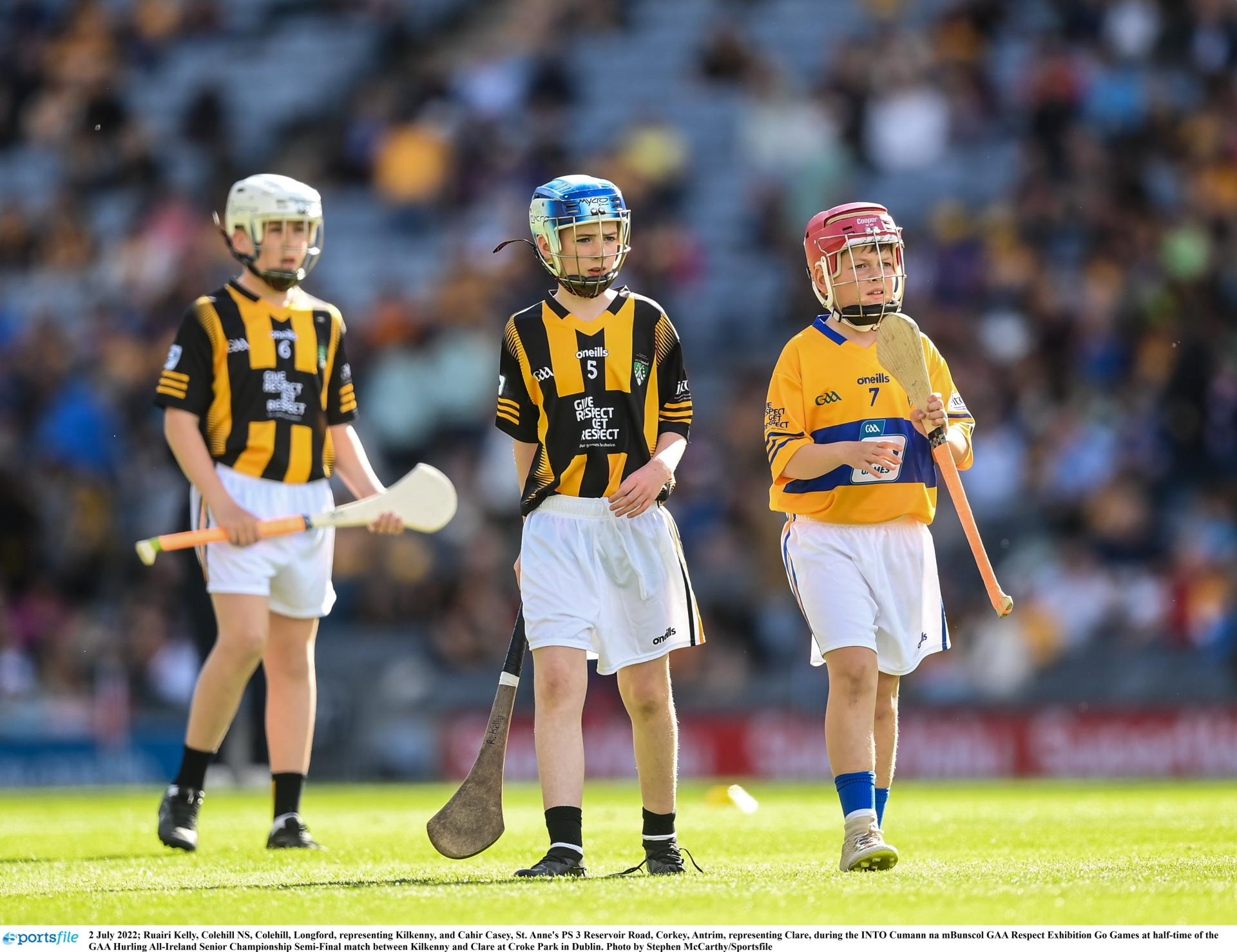 Caption: Ruairi Kelly, Colehill NS, Longford, representing Kilkenny, and Cahir Casey, St. Anne's PS 3 Reservoir Road, Corkey, Antrim, representing Clare, during the INTO Cumann na mBunscol GAA Respect Exhibition Go Games at half-time of the GAA Hurling All-Ireland Senior Championship Semi-Final between Kilkenny and Clare at Croke Park last Saturday Picture: Stephen McCarthy/Sportsfile