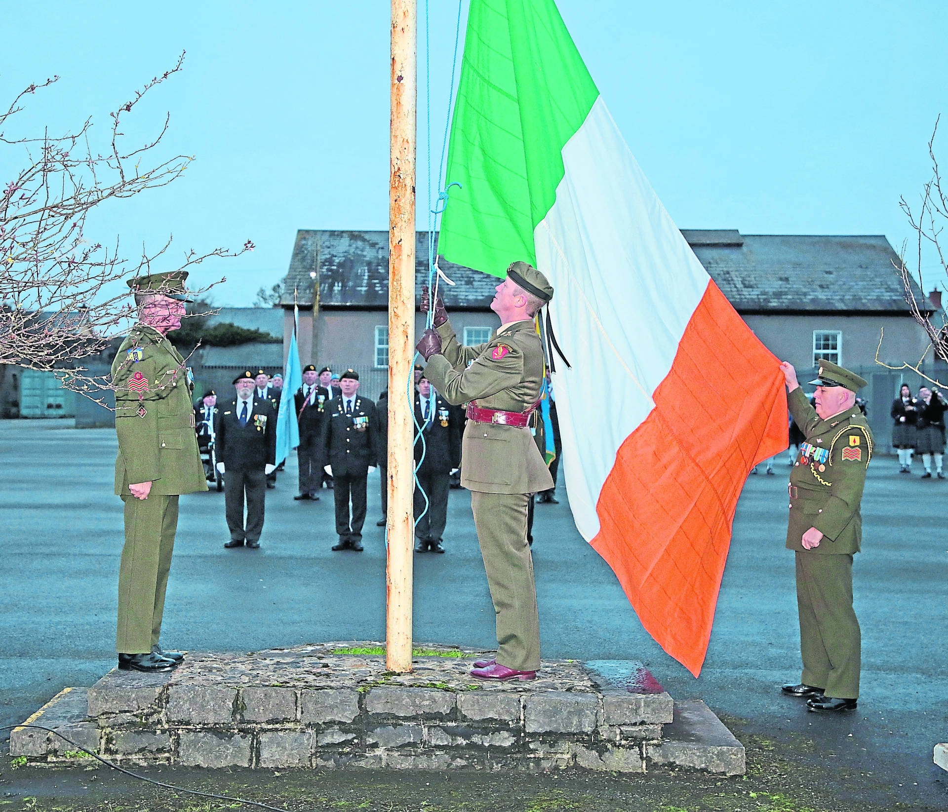 Raising the Irish flag during last Thursday's ceremony to mark the centenary of the handover of the barracks to the IRA were Peadar McGarry, Martin Clabby and Liam Forde