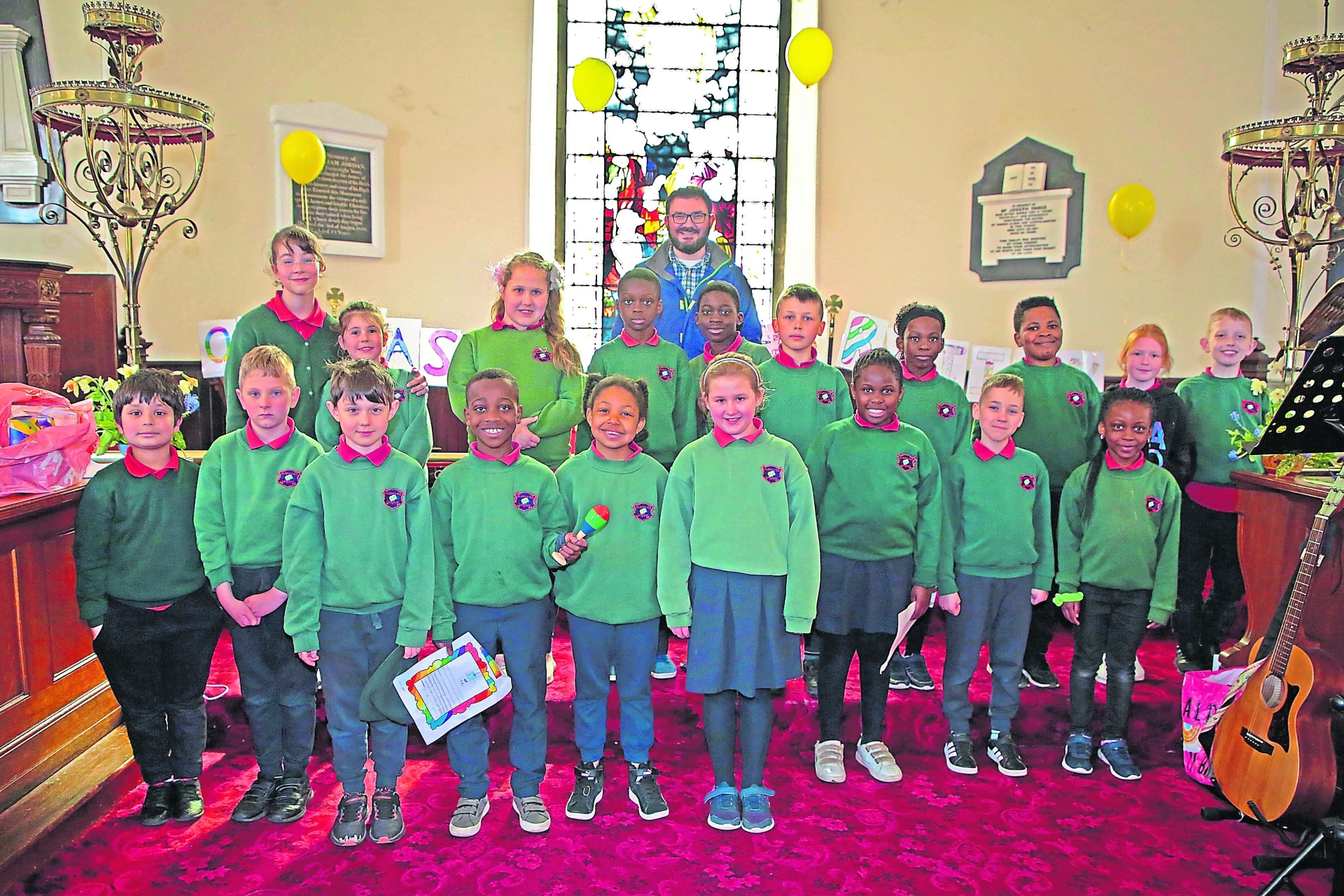 Clement Farrar with 1st, 2nd and 3rd Class pupils at last Wednesday’s Easter celebration