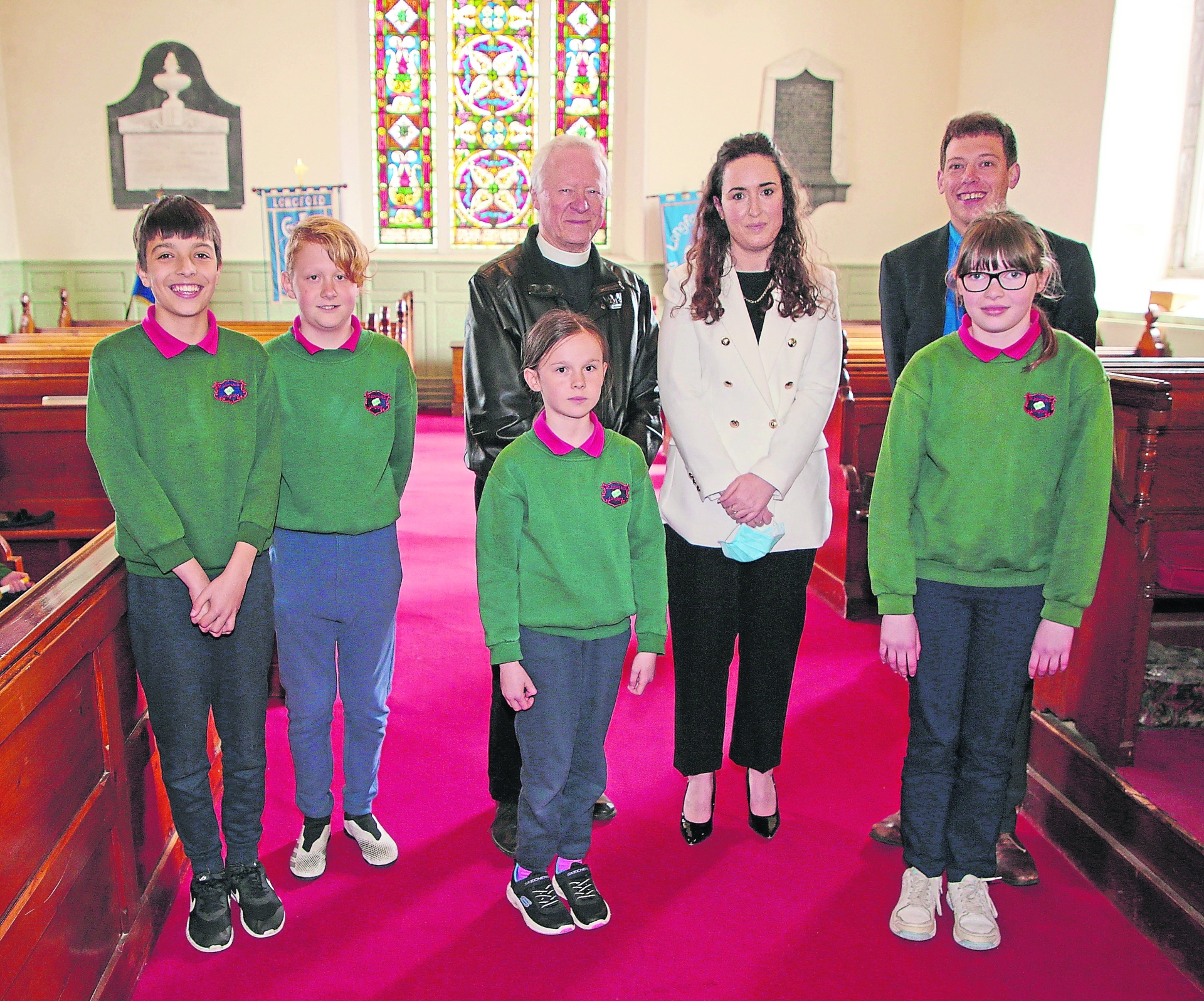 Children from the senior room at St John's NS, Battery Road, Longford, Principal Monica Mulholland, Cannon David Catterall and Rev Simon Scott at the Easter Celebration last week
