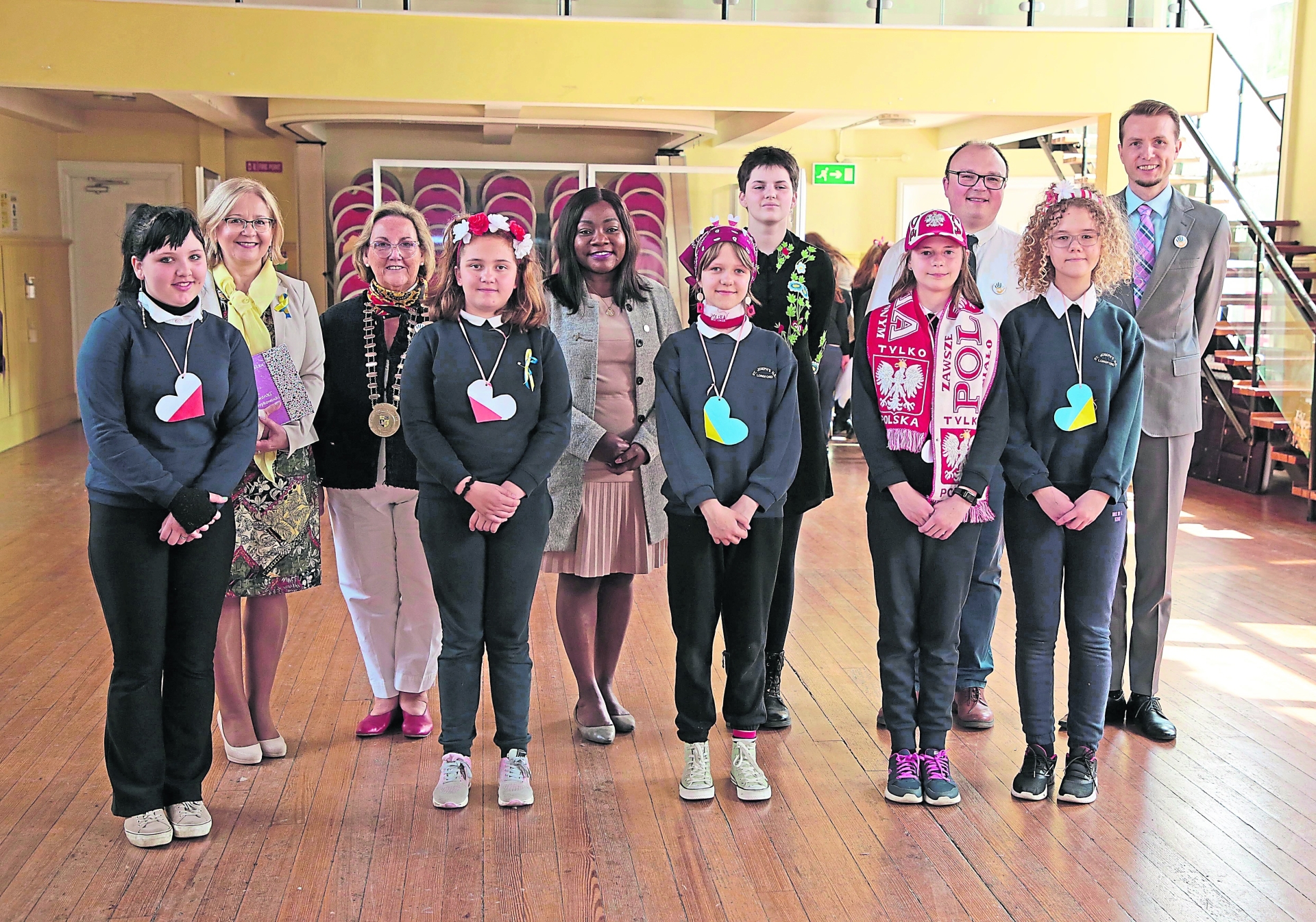 In St Joseph’s National School, Longford town last Wednesday for the visit of the Polish Ambassador to Ireland were; Ambassador Anna Sochanska, Cathaoirleach of Longford County Council Cllr Peggy Nolan, Cathaoirleach of Longford MD Cllr Uruemu Adejinmi, Chairman of Midlands Polish Community CLG Slavek Kazek, opera student from Ukraine Amalia Shmyhouska, Deputy Counsellor in the Polish Embassy, Dublin Maciej Wojcik, Wiktoria Figlak, Eliza Nowakowska, Weronika Kostyra , Vanessa Waskowska and Urszula Gruziola. Also see report on page 8 Picture: Shelley Corcoran