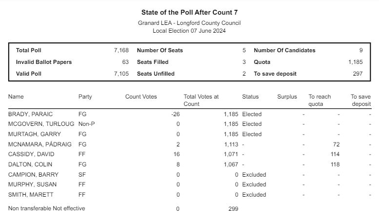 David Cassidy of Fianna Fáil and Padraig McNamara of Fine Gael were declared the final two candidates elected in the Granard Municipal District shortly after 9pm on Monday night.