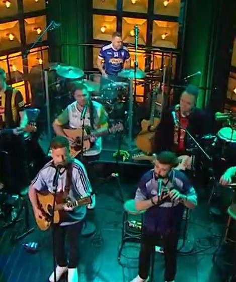 During George Murphy's rousing performance of 'Whiskey in the Jar', musical director of The Late Late Show and hit record producer Jonathan Owens, on drums, was spotted in the colours of his native club, St Mary's Granard.