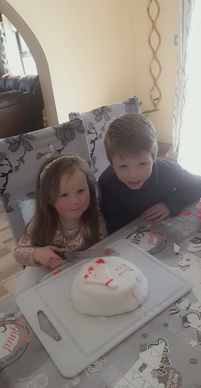 Five-year-old Ella and her brother Kian (9) are pictured below cutting the cake for her birthday.
