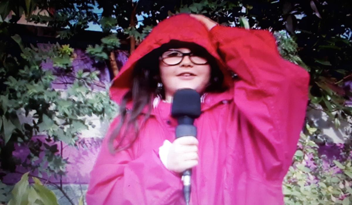 Young Longford TV reporter Cora Lennon from Edgeworthstown, inspired by RTE's Teresa Mannion, no doubt, urges us all to not make unnecessary journeys during Hurricane Ophelia.